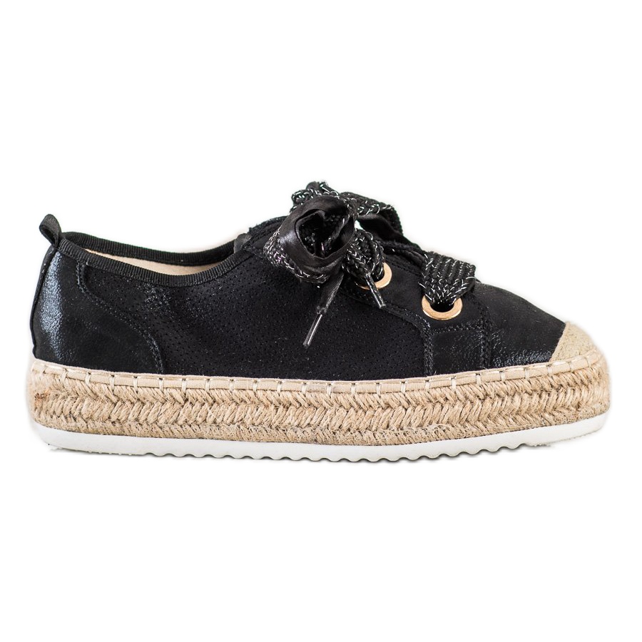 Dank ihrer universellen schwarzen Farbe passen sie perfekt zu Hosen, Sportröcken und Kleidern. Diese aus Faux-Wildleder gefertigten Schuhe sind nicht nur stilvoll, sondern auch umweltfreundlich. Dank des Textileinsatzes sind die Espadrilles angenehm zu tragen und der weiche, eingearbeitete Absatz sorgt für Stabilität beim Tragen.