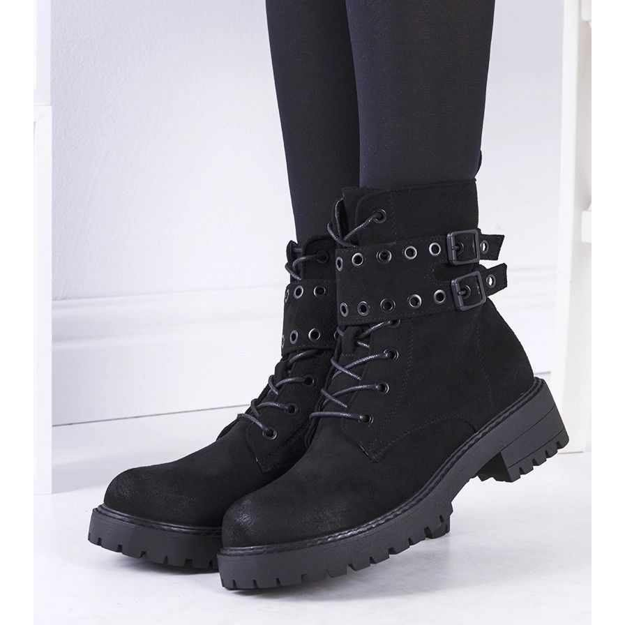 Klassische, Black Fallkirk Trapper sind eine Kombination aus Bequemlichkeit und modischem, rohen Stil. Sie sind auf eine dicke, geschützte Kunststoffsohle mit abgerundeter Nase und einem dekorativen Gürtel mit Schnallen eingestellt. Sie eignen sich perfekt für alltägliche, lässige Stylisationen. Das obere ökologische Leder aus Wildleder, isoliertem Innenraum - perfekt für die Herbst/Winter -Saison.