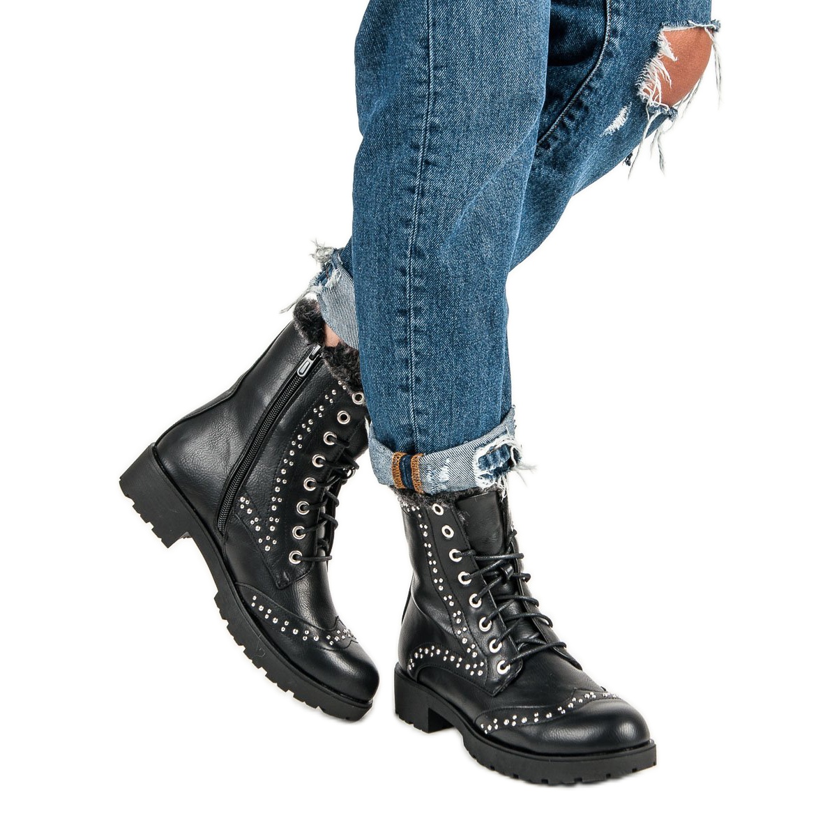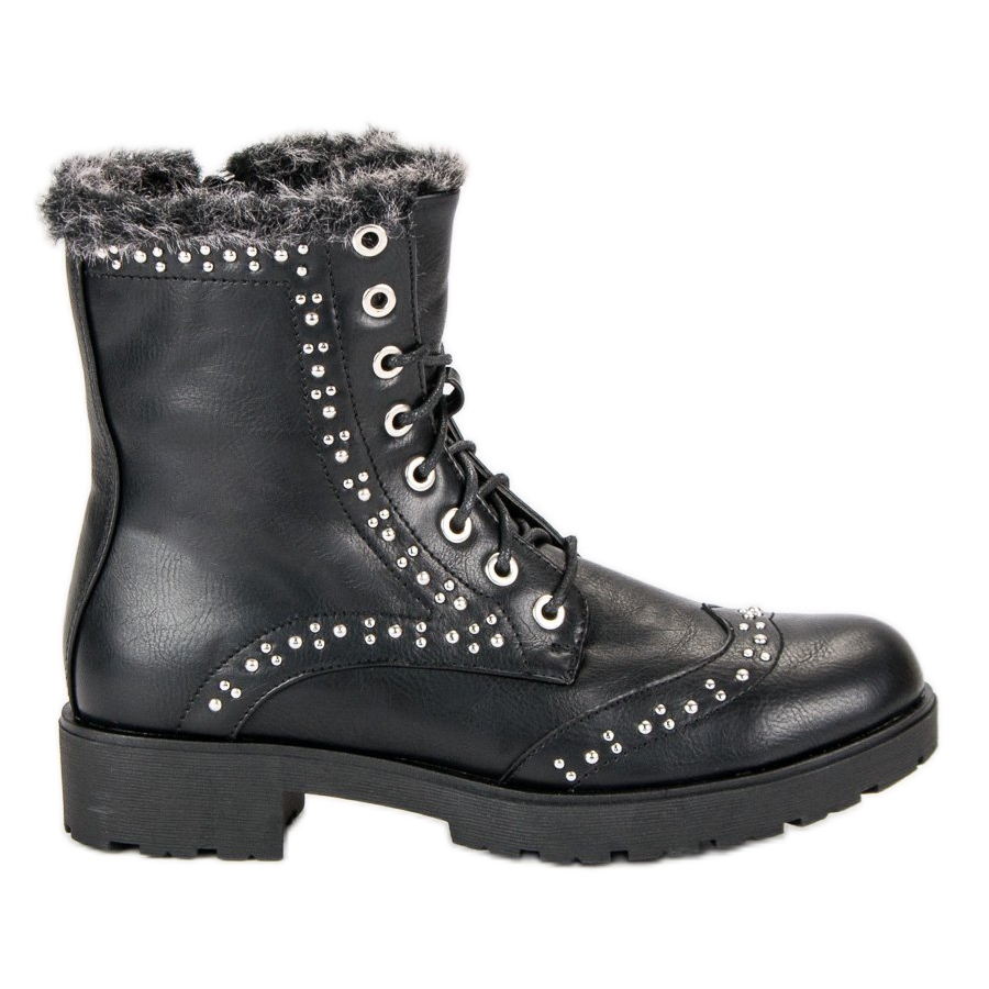 Arbeiter zeichnen sich durch ihr rockiges Design aus, das mit glänzenden Strasssteinen verziert ist, die ihnen Charakter und Eleganz verleihen. Klassische schwarze Schnürsenkel und dunkles Fell oben am Obermaterial sind Details, die Aufmerksamkeit erregen und dafür sorgen, dass diese Schuhe perfekt zu verschiedenen Stilen passen – sowohl lässig als auch eleganter.