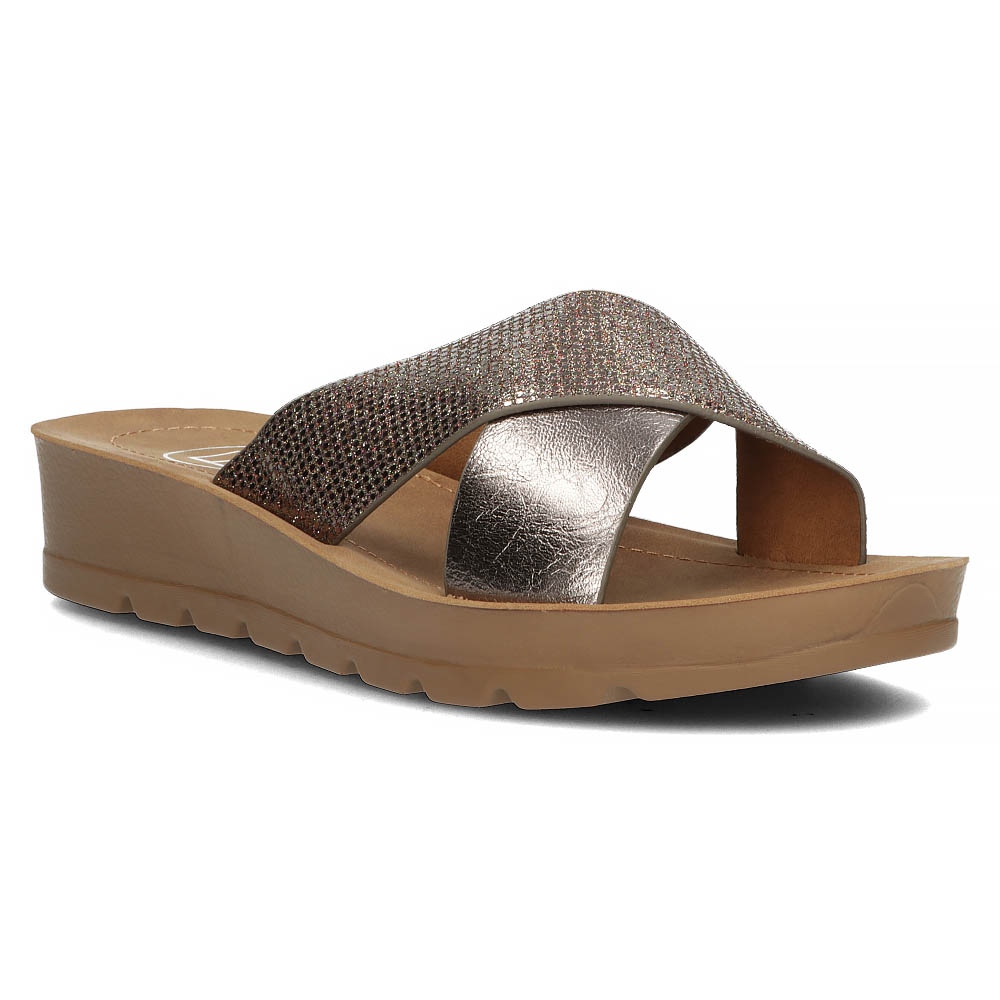 Dieses Modell zeichnet sich durch eine runde Spitze und einen 4 cm hohen Keilabsatz aus, der nicht nur ein paar Zentimeter Höhe, sondern auch Eleganz verleiht. Die Sohle aus Kunststoff und die Innensohle aus ökologischem Leder sorgen für Tragekomfort und zusätzliche metallische Eigenschaften verleihen jedem Sommer-Styling einen dezenten Stil.