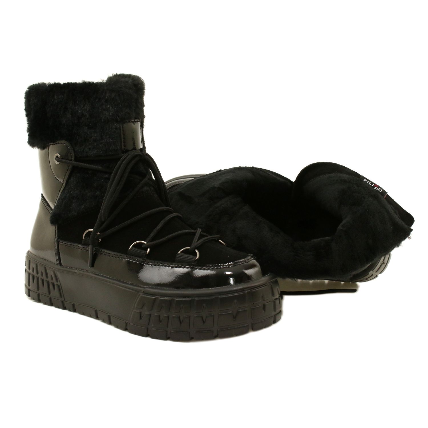 Filippo Elegante und praktische Schneestiefel aus natürlichem bemaltem Leder in tiefem Schwarz. Mit einem weichen Fell mit einer höheren Sohle und einer flachen Ferse 4 cm gepatcht, kombinieren sie einen modischen, sportlichen Charakter mit Komfort und Schutz gegen Kälte. Perfekt für coole, rutschige Tage - universelle Farben lassen Sie sie leicht an alltägliche und städtische Stilisationen anpassen.