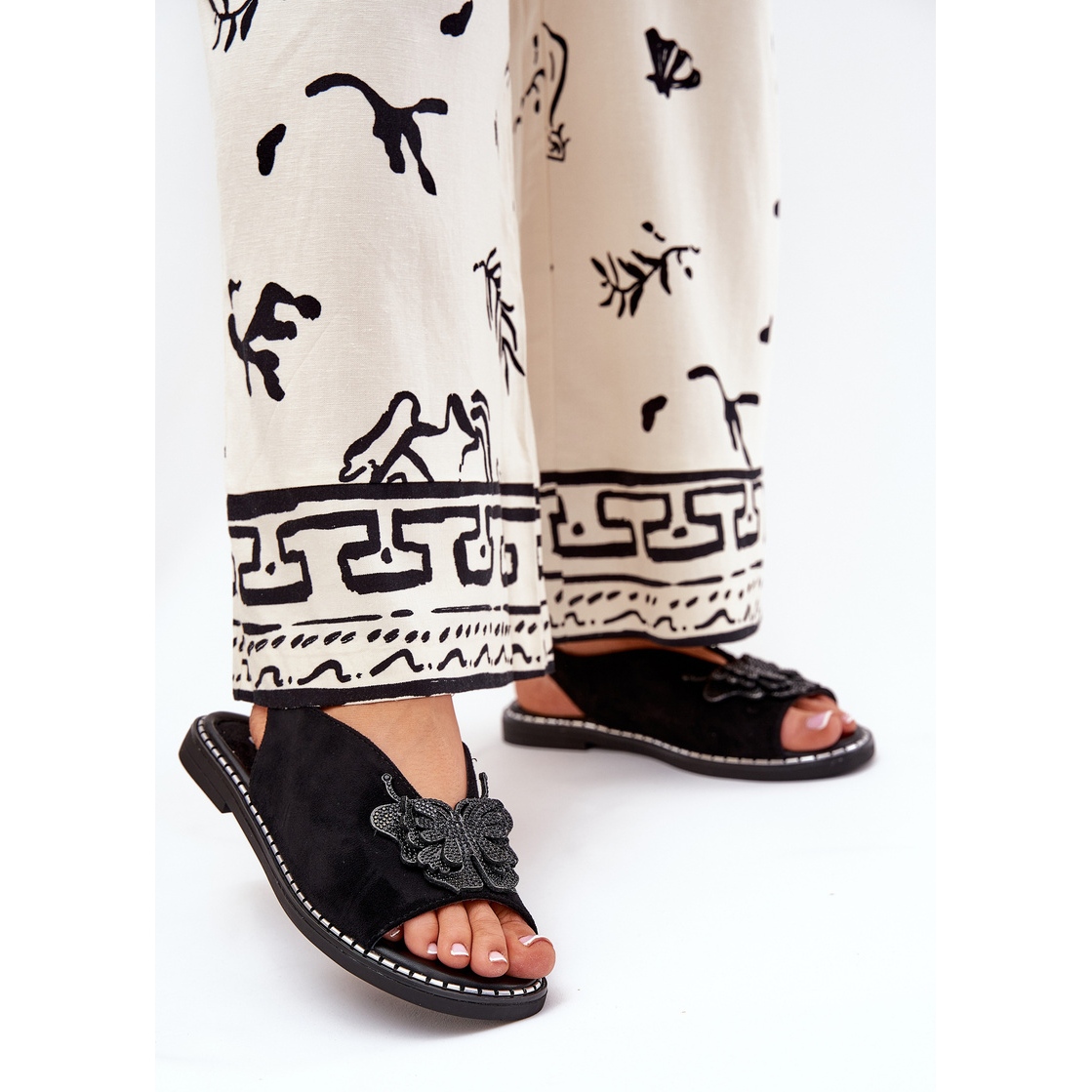 Details: Jezzi Flach -geköpfte Frauensandalen mit einer schwarzen Dekoration