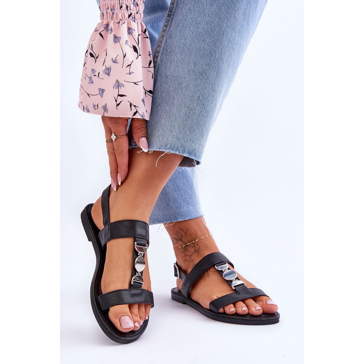 Das Modell steht auf einem 1 cm hohen, flachen Absatz, wodurch es perfekt für den Alltag geeignet ist. Die rutschfeste Gummisohle sorgt für Sicherheit auf verschiedenen Untergründen. Durch den klassischen Schnitt ohne Spitze und die einheitliche schwarze Farbe mit dezenten silbernen Akzenten passen die Sandalen perfekt zu verschiedenen Stilrichtungen.