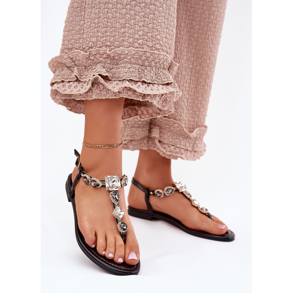 Details: Flache Frauensandalen mit schwarzen Kristallen