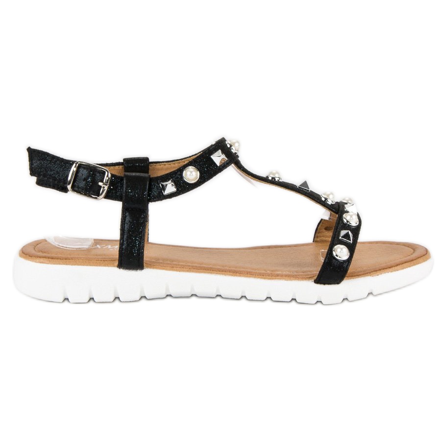 Wir präsentieren flache Sandalen mit schwarzen Strasssteinen, eine perfekte Wahl für warme Sommertage. Diese einzigartigen Damensandalen zeichnen sich durch einen eleganten, klassischen Schnitt und ein attraktives Finish in Form von Metall-Strasssteinen aus, die ihnen einen originellen und räuberischen Look verleihen.