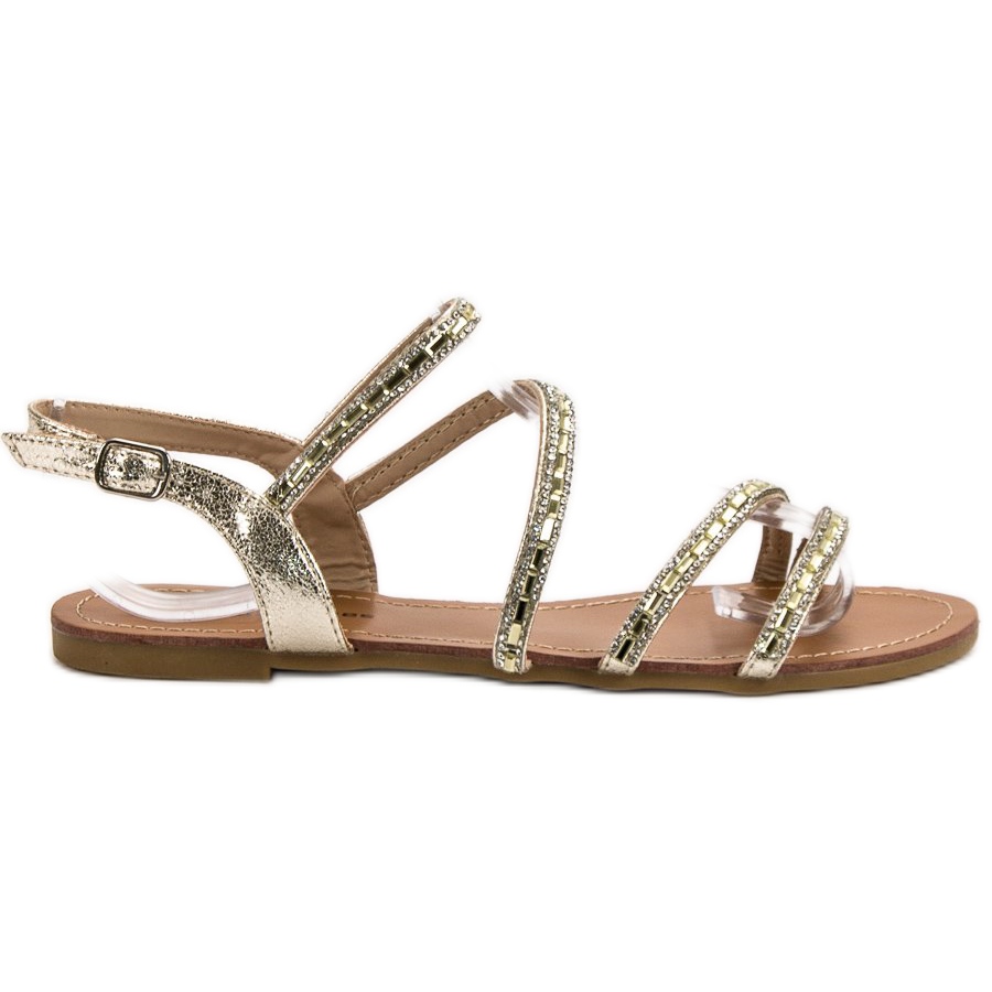 L. Lux Sandalen. Schuhe sind die perfekte Wahl für jede modebewusste Frau, die an warmen Tagen Stil und Komfort genießen möchte. Diese flachen Sandalen in Gelb- und Goldtönen zeichnen sich durch elegante Zirkonverzierungen aus, die ihnen einen einzigartigen Charakter verleihen. Der Schnallenverschluss sorgt nicht nur für einen angenehmen Tragekomfort, sondern sorgt auch für dezente Eleganz.
