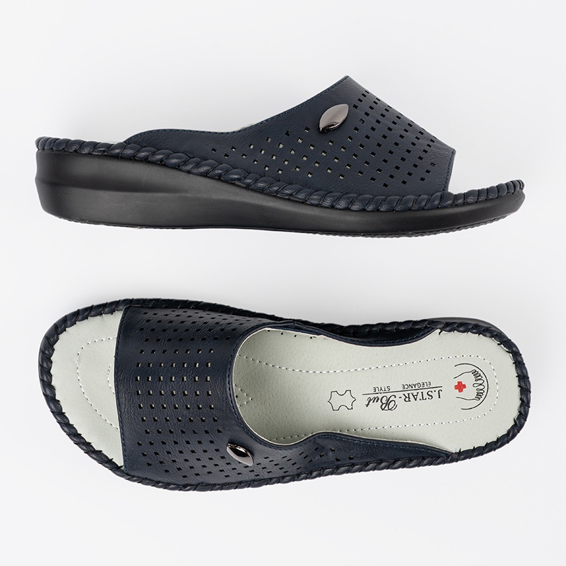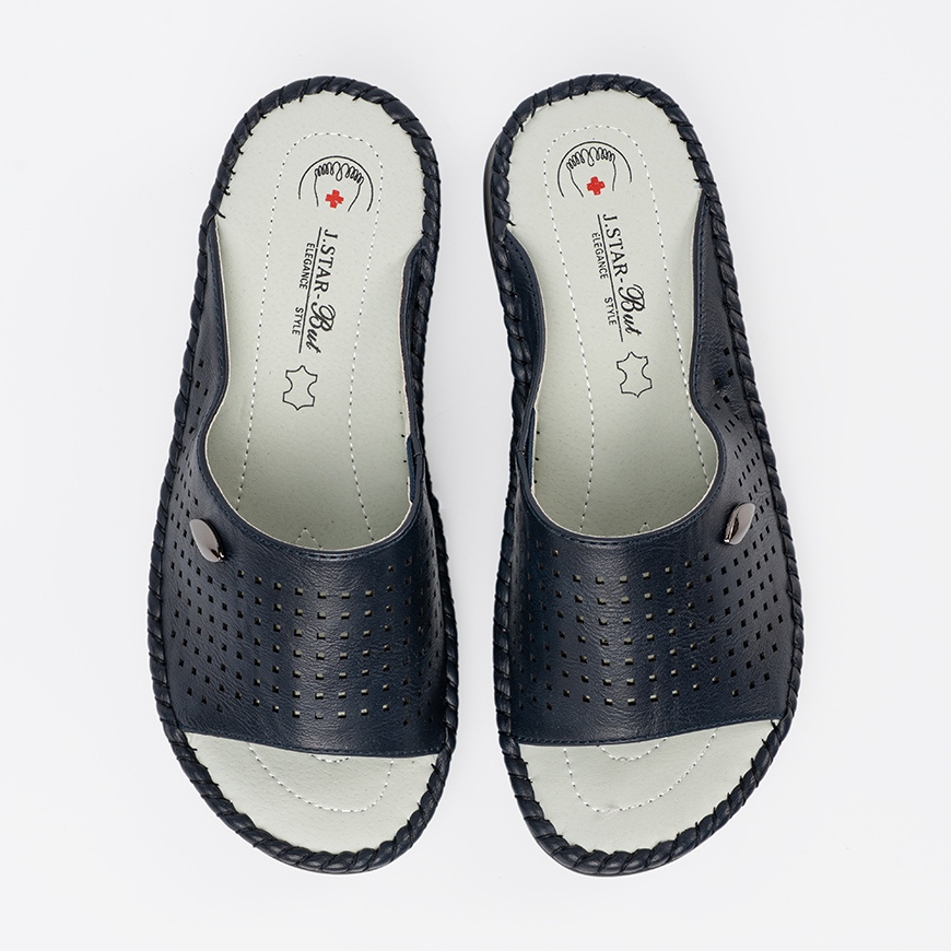 Wir präsentieren Marineblue -Frauen -Hausschuhe mit einem Ledereinsatz, die eine ideale Kombination aus Stil, Komfort und hoher Qualität darstellen. Diese Rutschflip -Flops einer seriösen Marke werden zu einer guten Wahl für Sommertage und tägliche Ausflüge. Dank der flachen Ferse mit einer Höhe von 3,5 cm sind sie selbst bei langfristigen Verschleiß äußerst bequem.