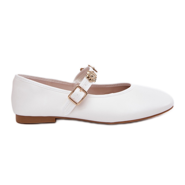 Hier ist ein eleganter Vorschlag für jeden Anlass - Frauen -Ballerinas mit einem Gürtel und goldenen Stiften in Weiß. Diese Ballerinas aus hochwertigem Öko -Leder sind ein idealer Begleiter Ihrer Sommerstilisierungen.