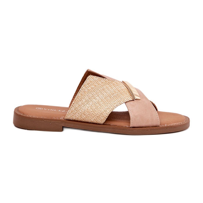 Women's Vinceza 17385 Flat -Heeled Pantoffeln in Beige ist die perfekte Wahl für Sommertage und kombiniert Eleganz mit Komfort. Sie bestehen aus hochwertigem Öko -Leder und bieten nicht nur einen stilvollen Look, sondern auch bei jedem Schritt. Dank der Einführung ist das Anlegen und Entfernen der Klappen extrem einfach, und eine flache Ferse mit einer Höhe von 1,5 cm garantiert Stabilität und Komfort, den ganzen Tag zu tragen.