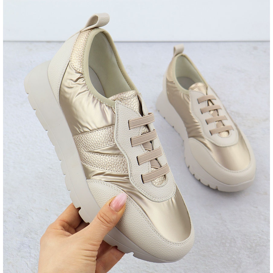 Entdecken Sie die ungewöhnlichen Sportschuhe für Vinceza-Frauen in einem faszinierenden metallischen beige-Gold-Farbton. Modell 58510 ist eine Kombination aus den neuesten Trends mit Komfort, die Sie jeden Tag zu schätzen wissen. Sie bestehen aus hochwertigem ökologischem Leder und erfreuen sich mit elegantem Erscheinungsbild und modernem Design.