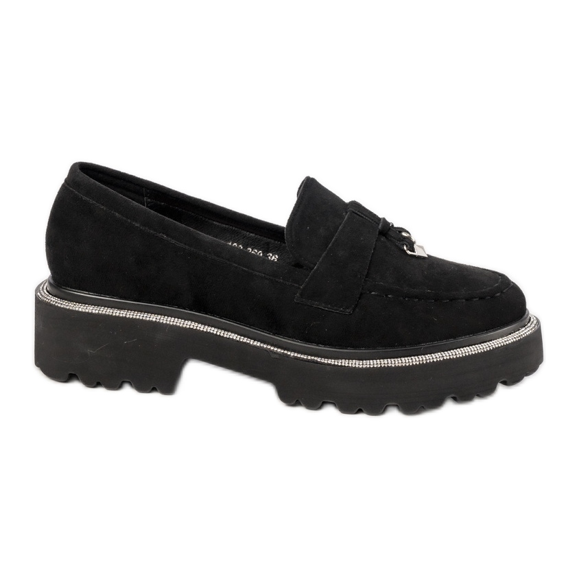 Entdecken Sie bei unvergleichlichem Komfort und Eleganz dank der schwarzen Mokas der Frauen mit Zirkonen. Das schwarze Modell ist eine perfekte Kombination von Klassikern mit modernen Details, die diese Schuhe zu einer perfekten Wahl für jeden Anlass machen.