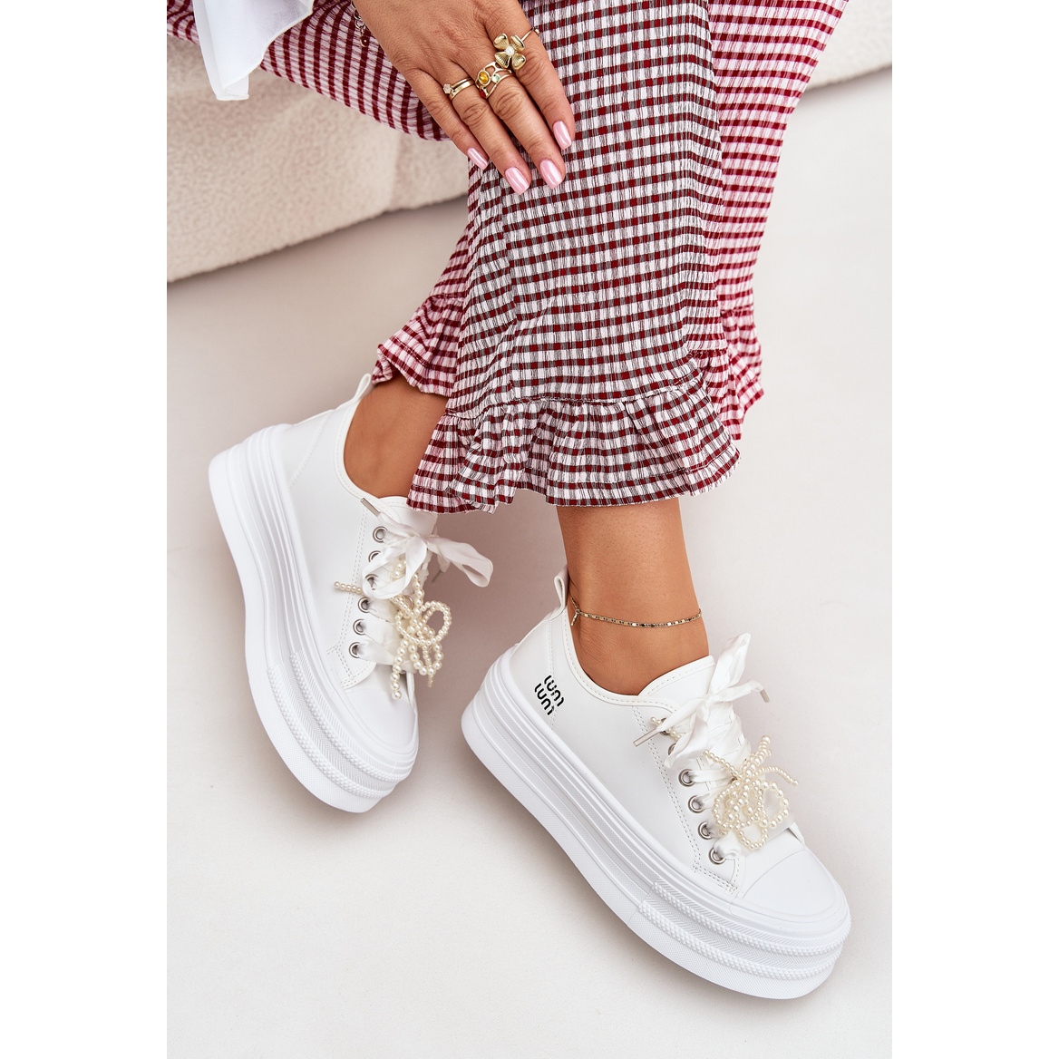 Damen -Sneaker auf der Plattform mit dekorativem Schnürung Weiß sind eine perfekte Kombination aus modernen Stil und Komfort, die perfekt in die lässige Natur der täglichen Stilisationen passt. Sie bestehen aus hochwertigem Öko -Leder und sehen extrem elegant aus. Eine massive Plattform mit einer Höhe von 5 cm bietet nicht nur einen modischen Look, sondern auch ein paar zusätzliche Zentimeter, was die Füße schlank aussehen lässt.