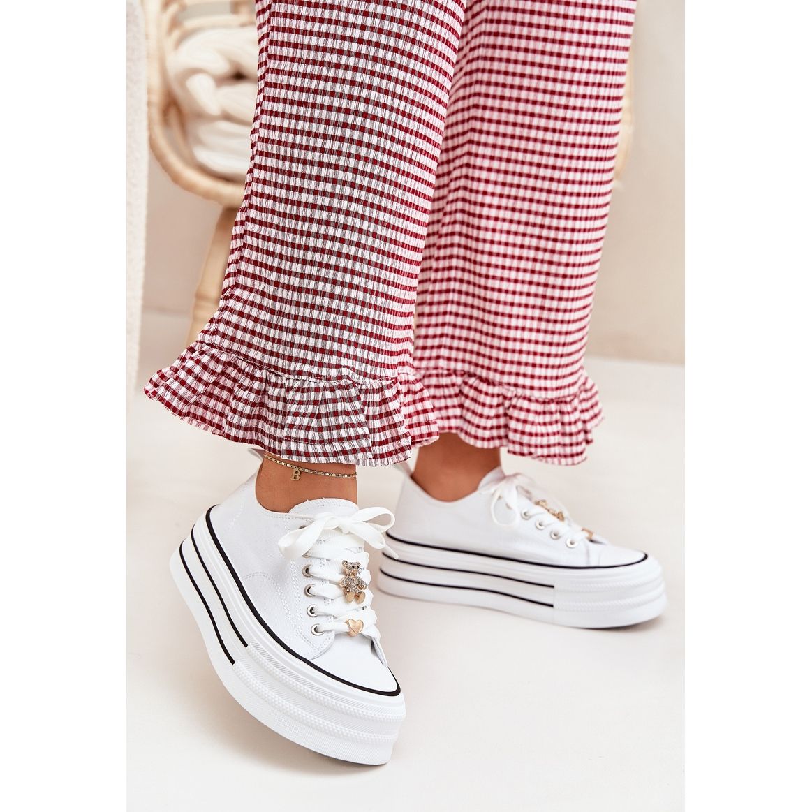 Turnschuhe haben eine runde Nase und einen Spitzenverschluss, mit dem Sie perfekt zum Fuß passen. Dank ihrer universellen weißen Farben mischen sie sich gut in verschiedene Outfits - von losen Hosen über Jeans bis hin zu luftigen Kleidern. Die Höhe der oberen 6,5 cm macht die Turnschuhe bequem und stabil.