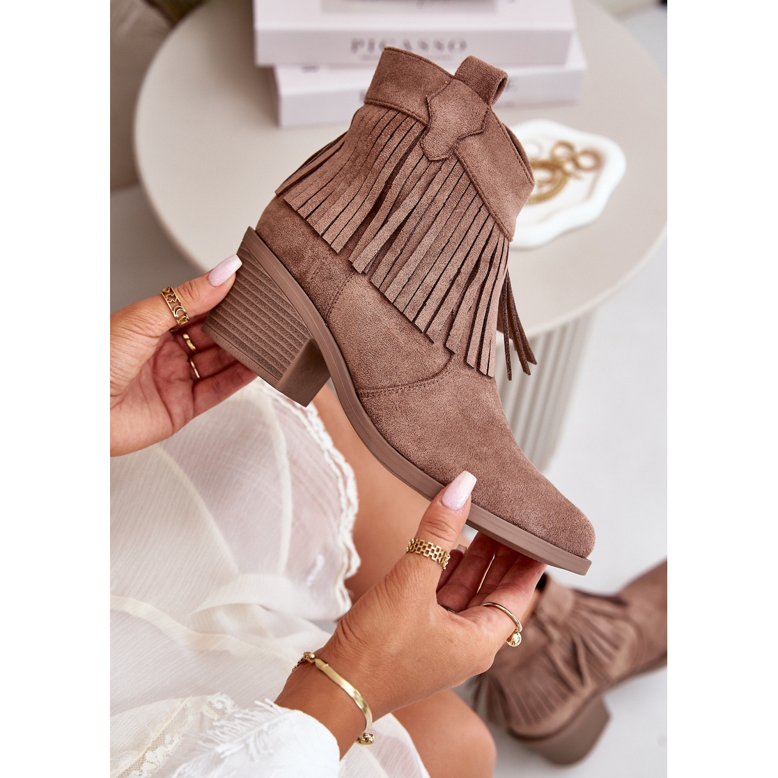 Diese Stiefel aus hochwertigen Öko-Messungen kombinieren elegantes Design mit Jugendstil. Die Fransen, die das Obermaterial dekorieren, geben ihnen Einzigartigkeit, was sie zu einer perfekten Ergänzung sowohl zum Alltag als auch zum formelleren Stylisationen macht. Dank des praktischen Verschlusss von Reißverschluss, das Schuhwaren anzieht und abhebt, wird es extrem einfach.