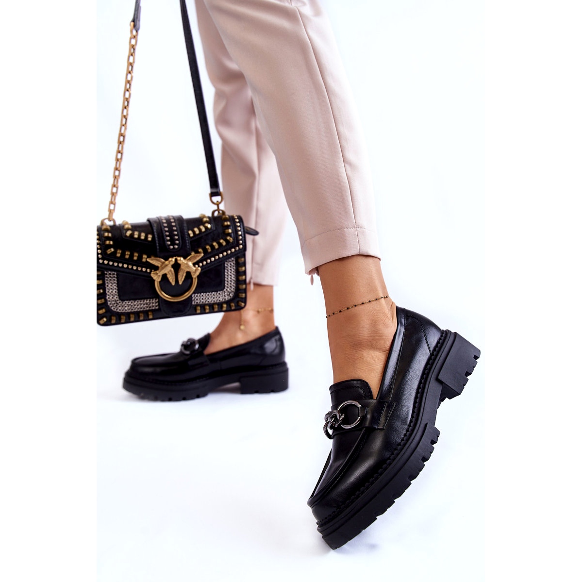 Frauen um Faux-Wildlederschuhe la.fi-stylische Loays, die Eleganz mit alltäglichem Komfort verbinden. Ein glattes, schwarzes Obermaterial aus hochwertigem ökologischem Leder wurde mit einer dekorativen Kette dekoriert, die Charakter verleiht und die Schuhe sowohl für das Büro als auch für Treffen mit Freunden hervorragend funktionieren lässt. Eine klassische, runde Nase und ein Slip -Befestigung garantieren sich, dass sie den ganzen Tag anziehen und tragen.