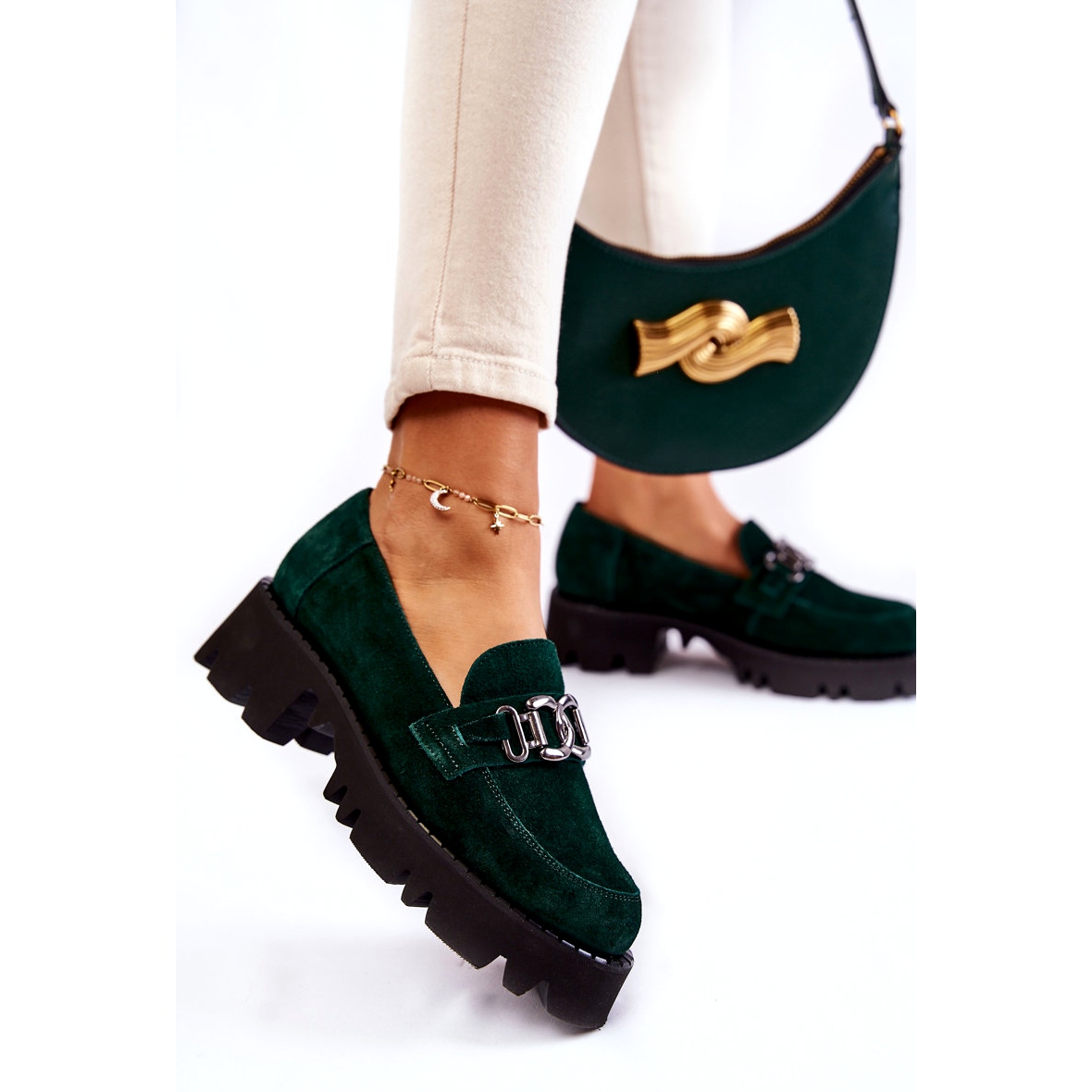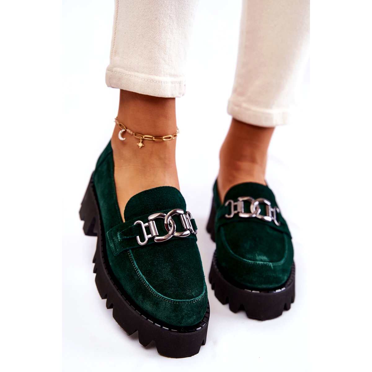 Elegant und komfortabel - perfekt für alltägliche und elegantere Stilisierungen. Sie bestehen aus hochwertigem natürlichen Wildlederleder mit einer subtilen Metalldekoration (Kette) auf der Vorderseite und fangen die Aufmerksamkeit auf, ohne den Komfort aufzugeben.