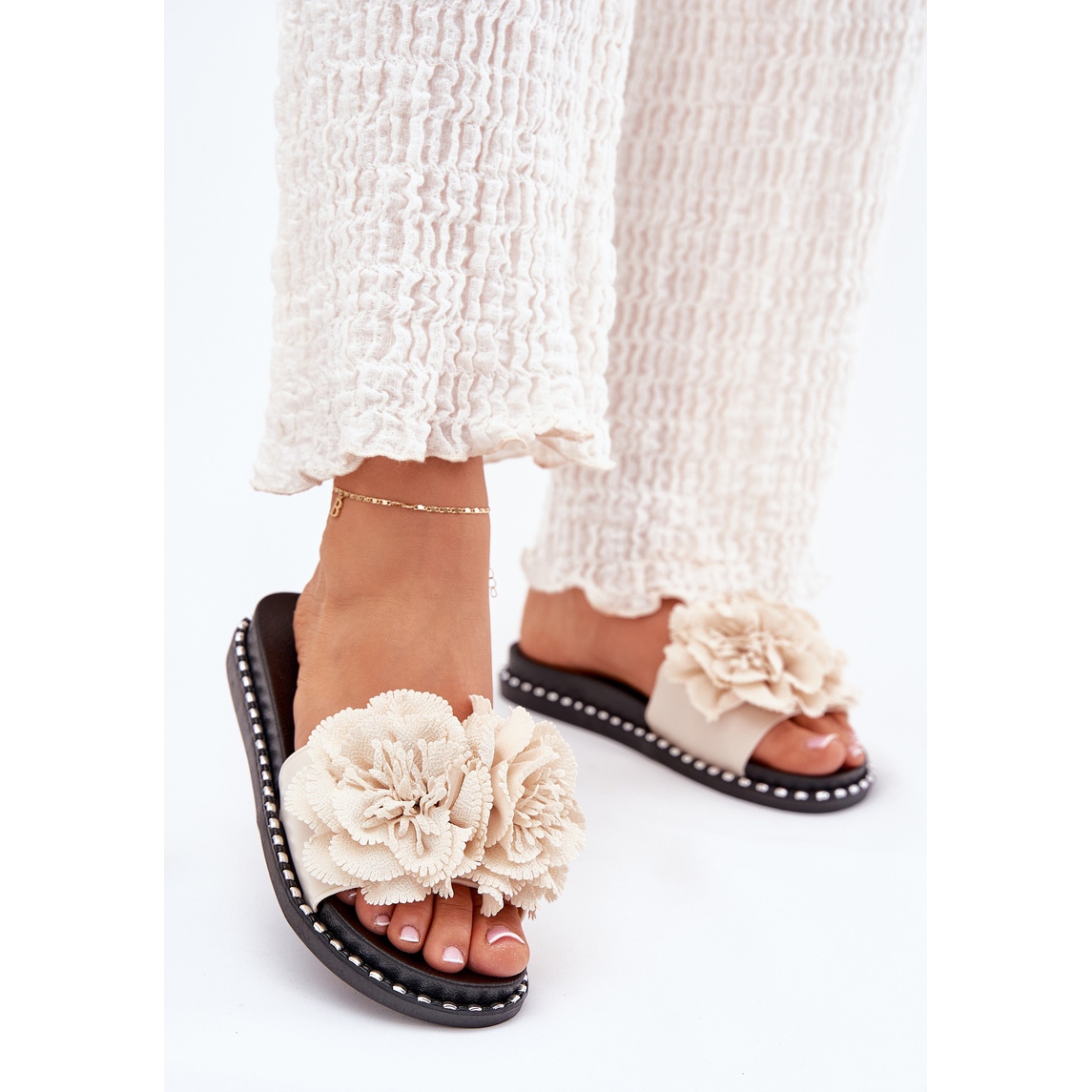 Ihr charakteristisches Element sind zarte materielle Blüten, die auf den Gürtel platziert sind und einen subtilen Charme erzeugen und jede Stiftung einen romantischen Charakter annehmen lassen. Die beige Farbe der Klappen passt perfekt zu verschiedenen Outfits, was sie zu einer universellen Ergänzung der Sommergarderobe macht.