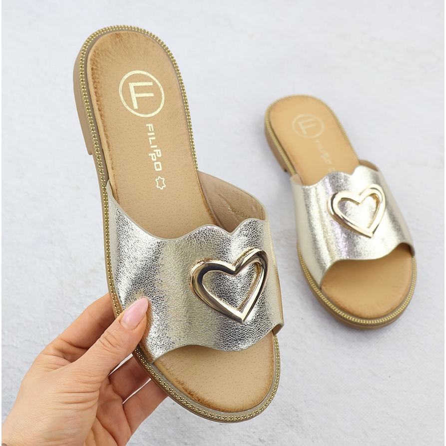 Entdecken Sie den einzigartigen Stil und den einzigartigen Komfort dank der Frauenklappen mit einem dekorativen Herzen der Marke Filippo. Das DK6909 -Modell in goldener Farbe ist ein ideales Angebot für Sommertage, das nicht nur einen modischen Look, sondern auch einen Bequemlichkeitsgrad des Tragens verleiht.