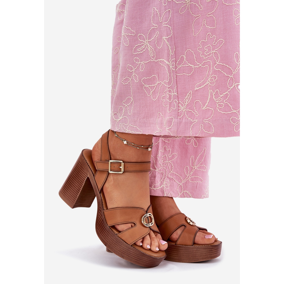 Ein stabiler Beitrag mit einer Höhe von 9,5 cm bietet nicht nur ein stilvolles Aussehen, sondern auch den Komfort, den ganzen Tag über zu tragen. Dank des mit einer Schnalle befestigten verstellbaren Riemens können Sie ihn leicht an Ihren Fuß anpassen, wodurch das Stufenvertrauen und die Bequemlichkeit garantiert werden.