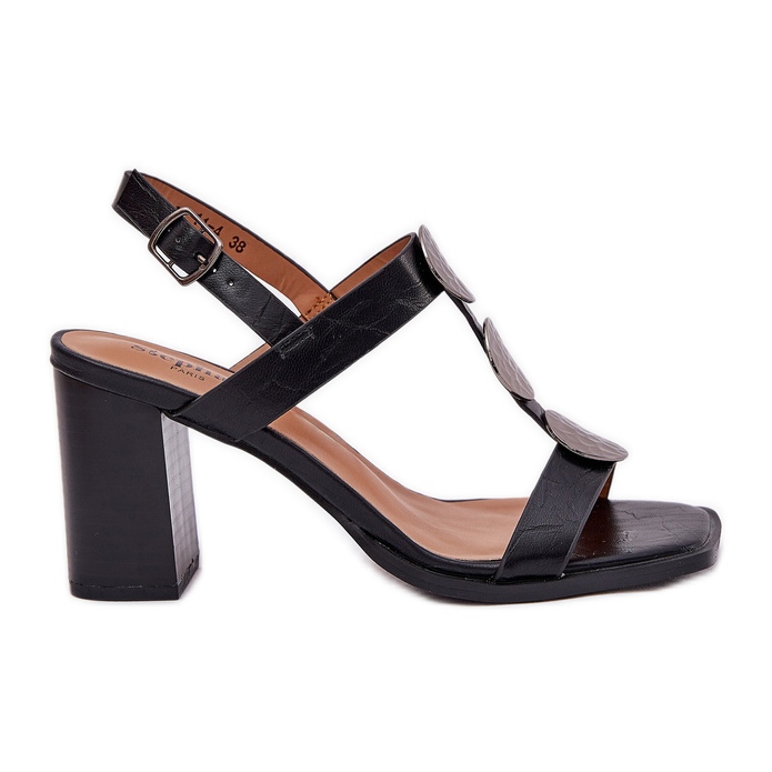 ** Frauensandalen auf einem Pfosten mit einem dekorativen Gürtel schwarz **