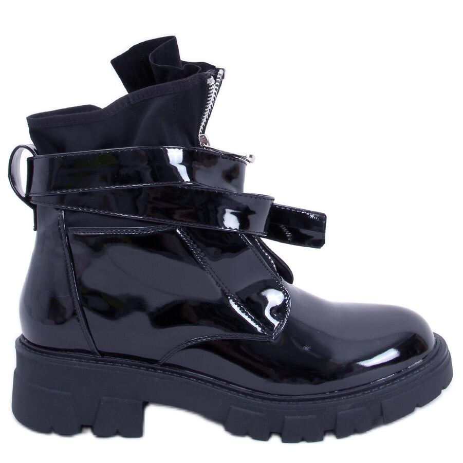 Auffällige Streifen und ein Reißverschluss vorne sind Details, die Aufmerksamkeit erregen und den Schuhen Originalität verleihen. Die schwarz lackierte Oberfläche passt perfekt zu einer Vielzahl von Stilen – von leger bis militärisch – und lässt Sie immer modisch und stilvoll aussehen.