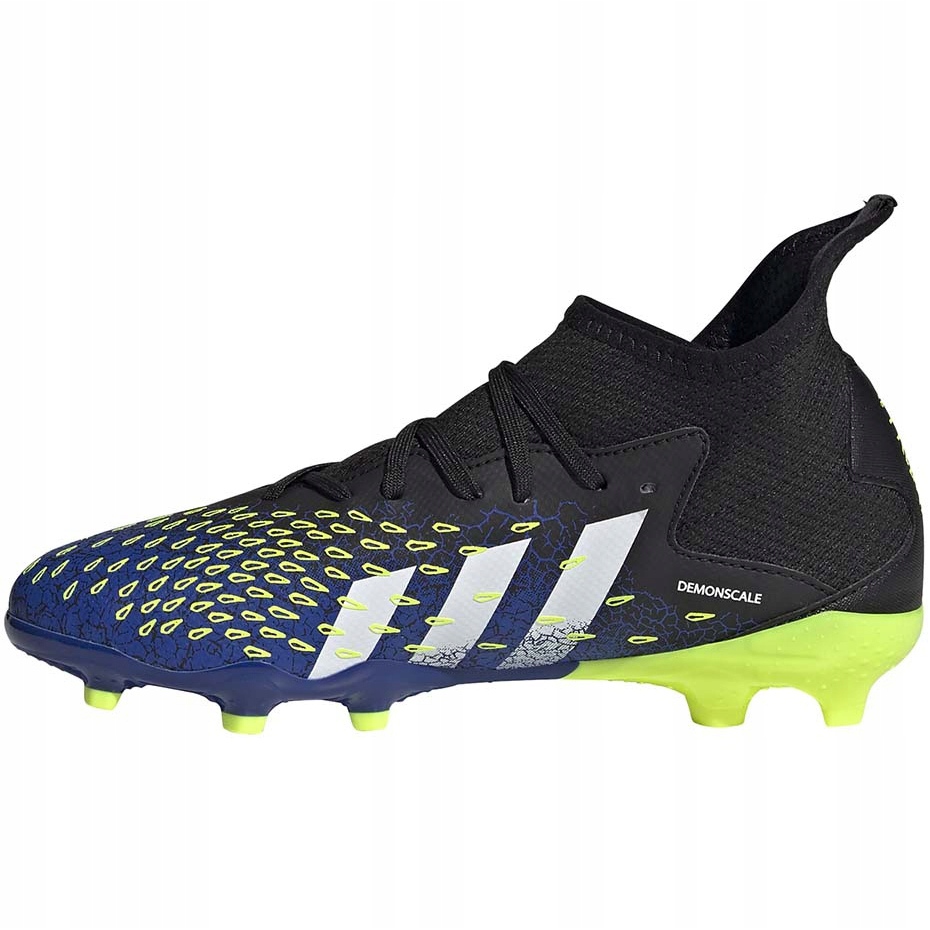Adidas Predator Freak.3 FG Junior (FY0613) Fußballschuhe - ideal für junge Spieler, die die Präzision und Kontrolle des Balls auf einer natürlichen Oberfläche erhöhen möchten. Das Modell kombiniert ein Geflecht, textiles Obermaterial mit synthetischen Elementen und konvexen dämonensiehtorten Zonen, die die Adhäsion des Balls beim Passieren, Laufen und Schüssen verbessern. Schwarze, elegante Farben wurden mit ausdrucksstarken gelben und blauen Akzenten ergänzt, was die sportliche Natur der Schuhe betont.