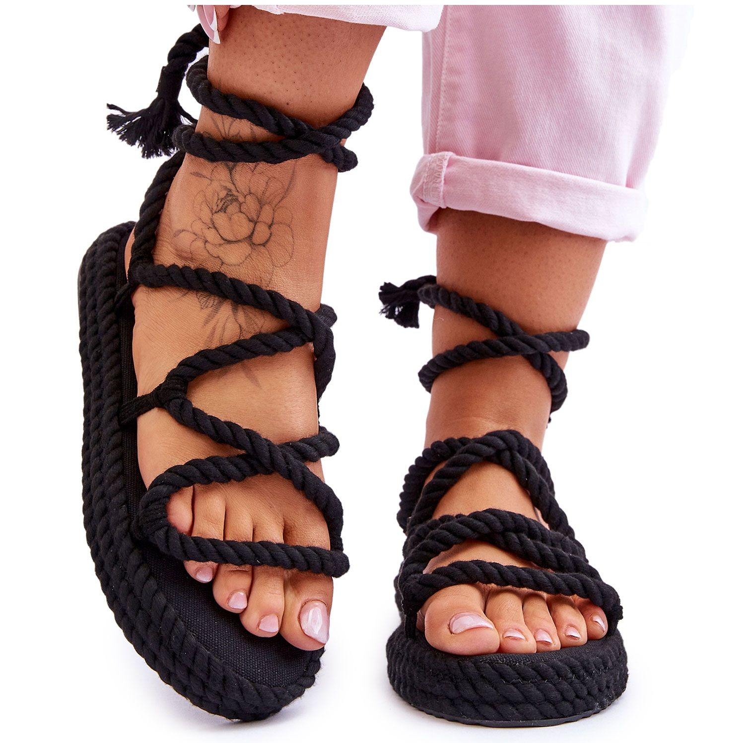 Die Sandalen sind auf einer soliden Plattform mit einer Höhe von 3,5 cm montiert, was nicht nur ein paar Zentimeter Höhe, sondern auch Stabilität bietet. Der Innenraum ist mit einer weichen Stoffeinlage ausgekleidet, wodurch Sie sich auch bei langen Spaziergängen wohlfühlen. Das Modell passt perfekt zum Boho-Styling und passt perfekt zu Sommerkleidern, Shorts und Röcken.