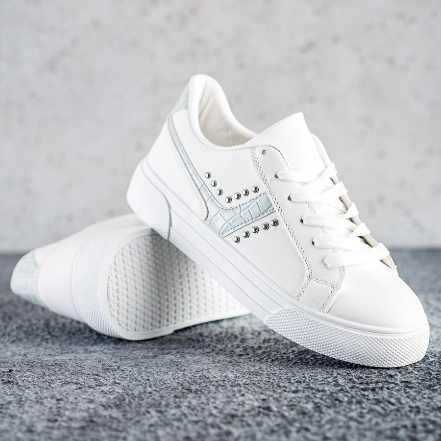 Es lohnt sich, auf das originelle Detail zu achten – den blauen Einsatz und die Strasssteine, die den Schuhen Charakter verleihen und sie von anderen Modellen unterscheiden. Ohne Muster, in klassischem Weiß gehalten, sind sie ein universelles Garderobenelement, das sich problemlos mit einer Vielzahl von Accessoires kombinieren lässt.