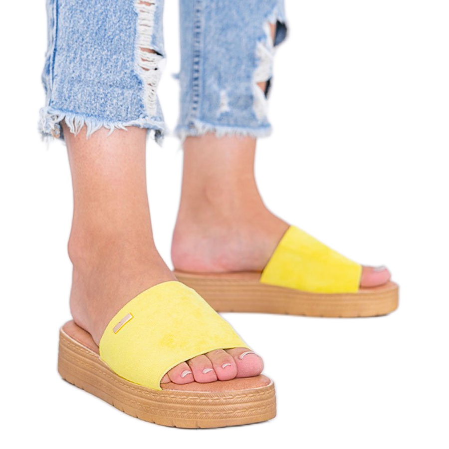 Die dicke 3,5-Zentimeter-Sohle ist in dieser Saison ein Hit und sorgt für Stabilität und Komfort bei langen Spaziergängen. Das Obermaterial aus ökologischem Wildleder in einer schönen gelben Farbe verleiht den zehenstegsandalen einen einzigartigen Charakter und lässt sie perfekt zu lässigen Styles passen.