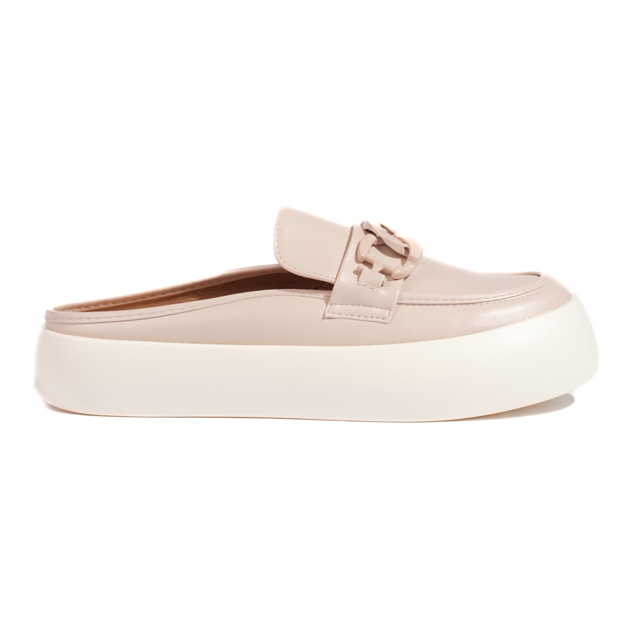 Die äußere und die innere Schicht besteht aus hochwertigem ökologischem Leder und sorgt für die Haltbarkeit und die einfache Aufrechterhaltung. Darüber hinaus macht ein komfortabler ökologischer Ledereinsatz jeden Schritt bequem und angenehm. Ein zusätzlicher Vorteil sind die Details in Form einer Kette, die den Klappen einen modischen Charakter verleihen.