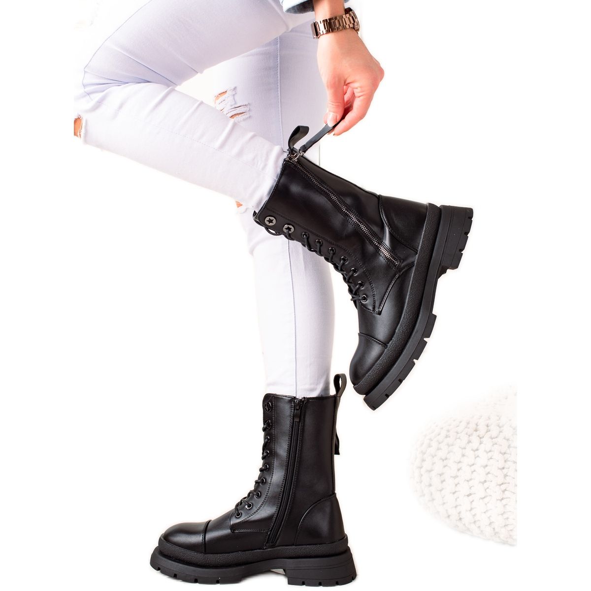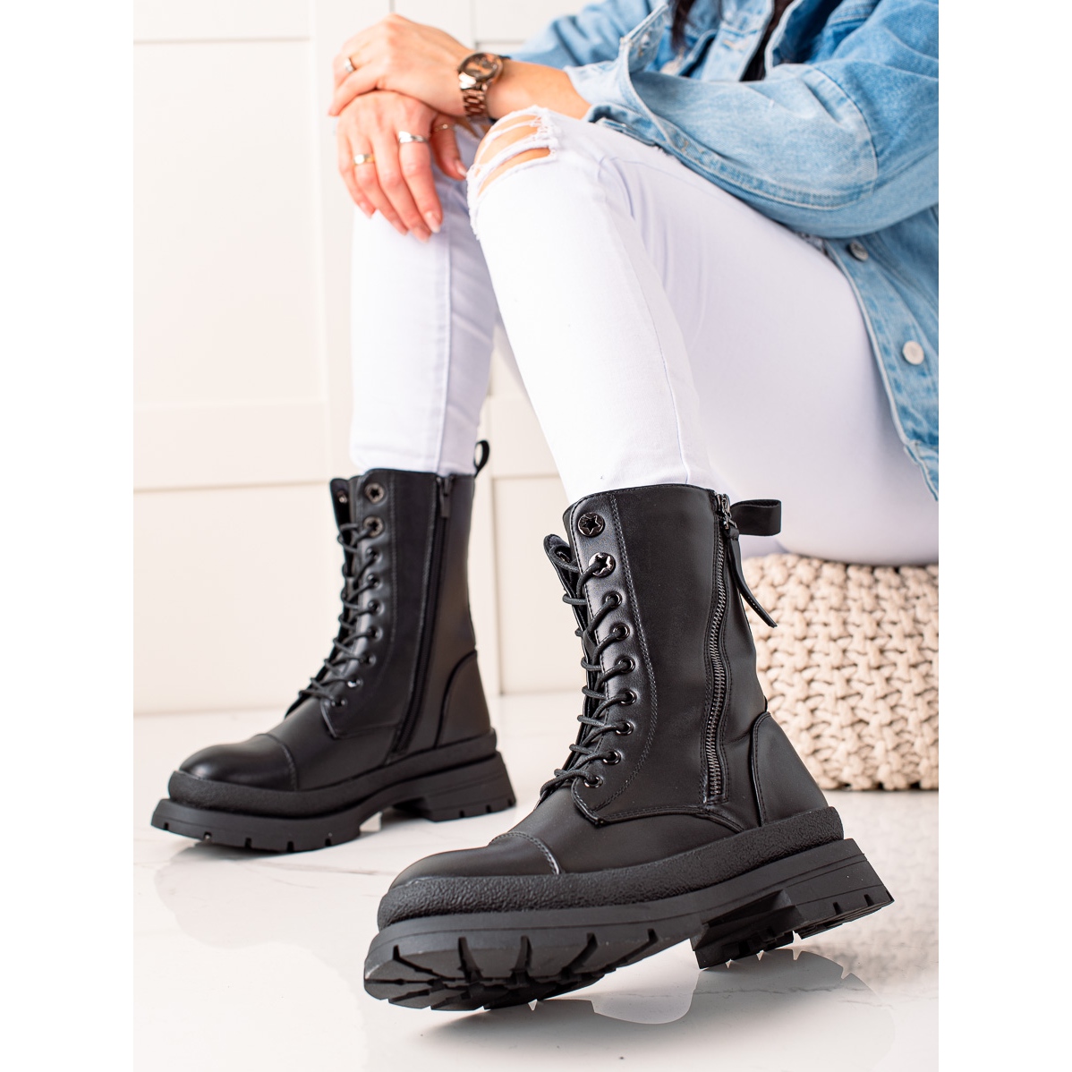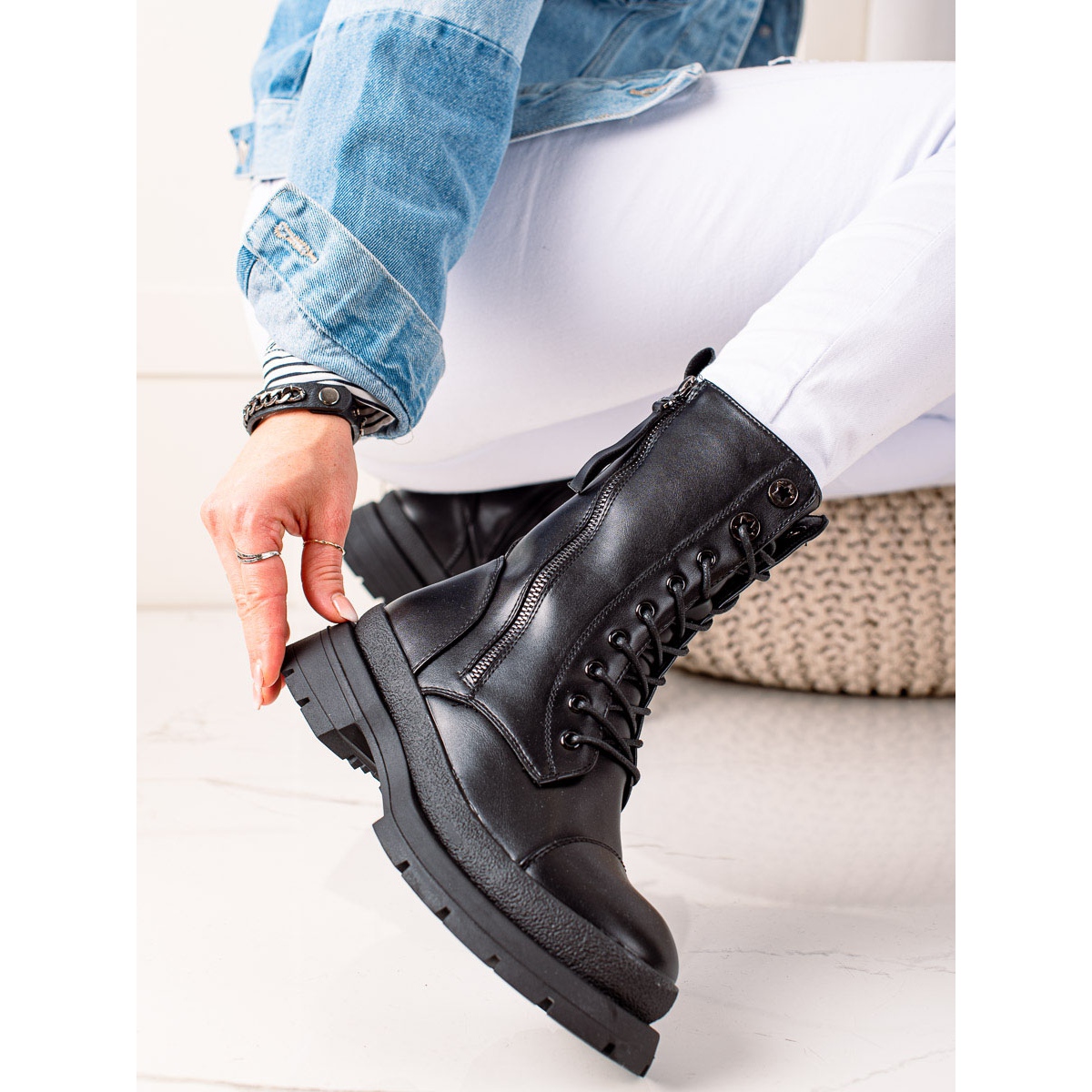 Die schwarzen Workerstiefel zeichnen sich außerdem durch einen dekorativen Reißverschluss aus, der ihnen einen modernen Look verleiht. Der Reißverschluss und das Schnürsystem ermöglichen eine perfekte Passform am Fuß, was für den Tragekomfort entscheidend ist.