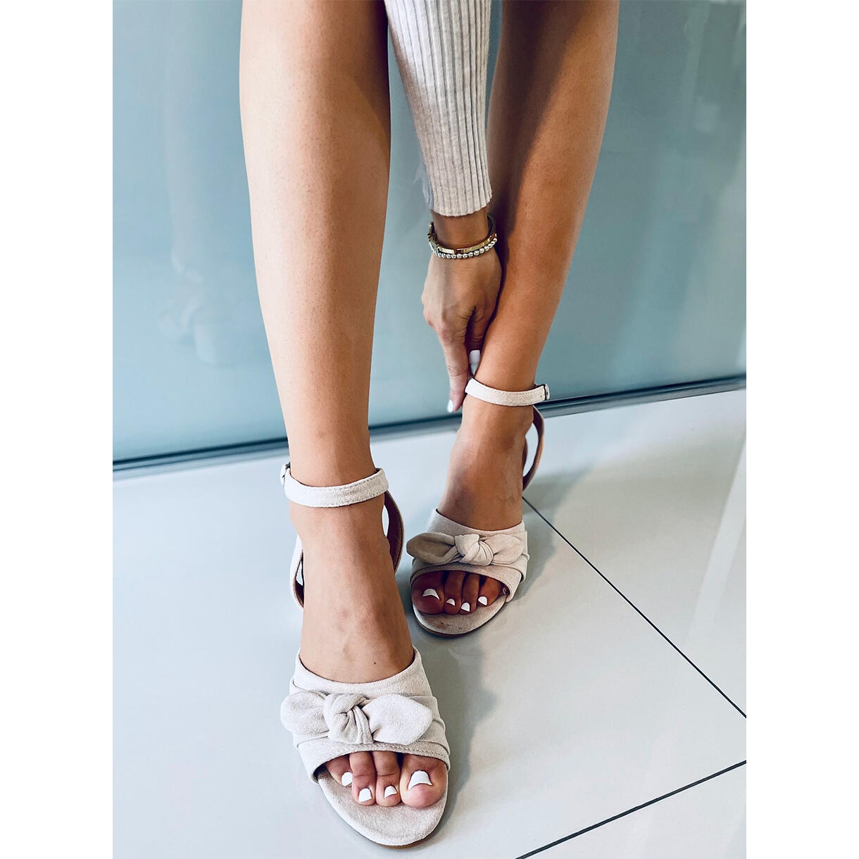 Ihr schlichtes Design mit verführerischer Schleife zieht die Blicke auf sich und der verstellbare Verschluss betont die Zartheit des Knöchels und sorgt gleichzeitig für Stabilität. Sie bestehen aus hochwertigem, ökologischem Wildleder und bieten nicht nur einen modischen Look, sondern schonen auch die Umwelt.