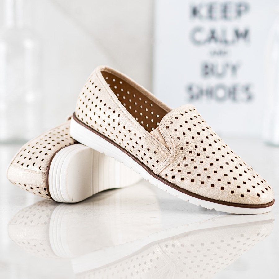 Wir präsentieren goldene, durchbrochene Slipons des Herstellers Kylie, die die perfekte Wahl für Frühling und Sommer sind. Diese stilvollen Schuhe werden mit Sicherheit die Aufmerksamkeit jedes Modeliebhabers auf sich ziehen. Ihre einzigartige, glänzende Goldfarbe ergänzt jedes lässige Styling und macht sie zu einem echten Must-have dieser Saison.