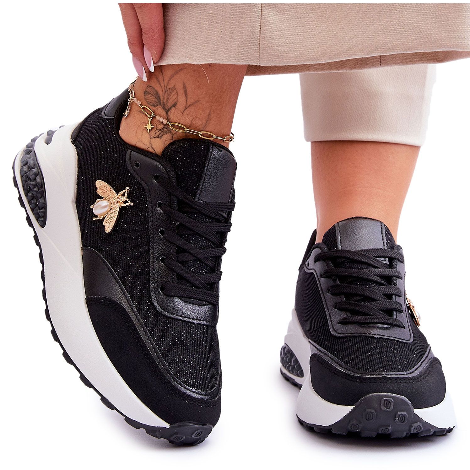 Sie stehen auf einer bequemen Plattform und einem niedrigen Keilabsatz und bieten Stabilität und Komfort bei alltäglichen Aktivitäten. Ein interessanter Akzent ist die seitlich am Obermaterial angebrachte Insektenverzierung, die den Schuhen einen einzigartigen Charakter verleiht. Die klassische Schnürung ermöglicht eine perfekte Anpassung an die Beinform, was sicherlich jeder Frau gefallen wird.