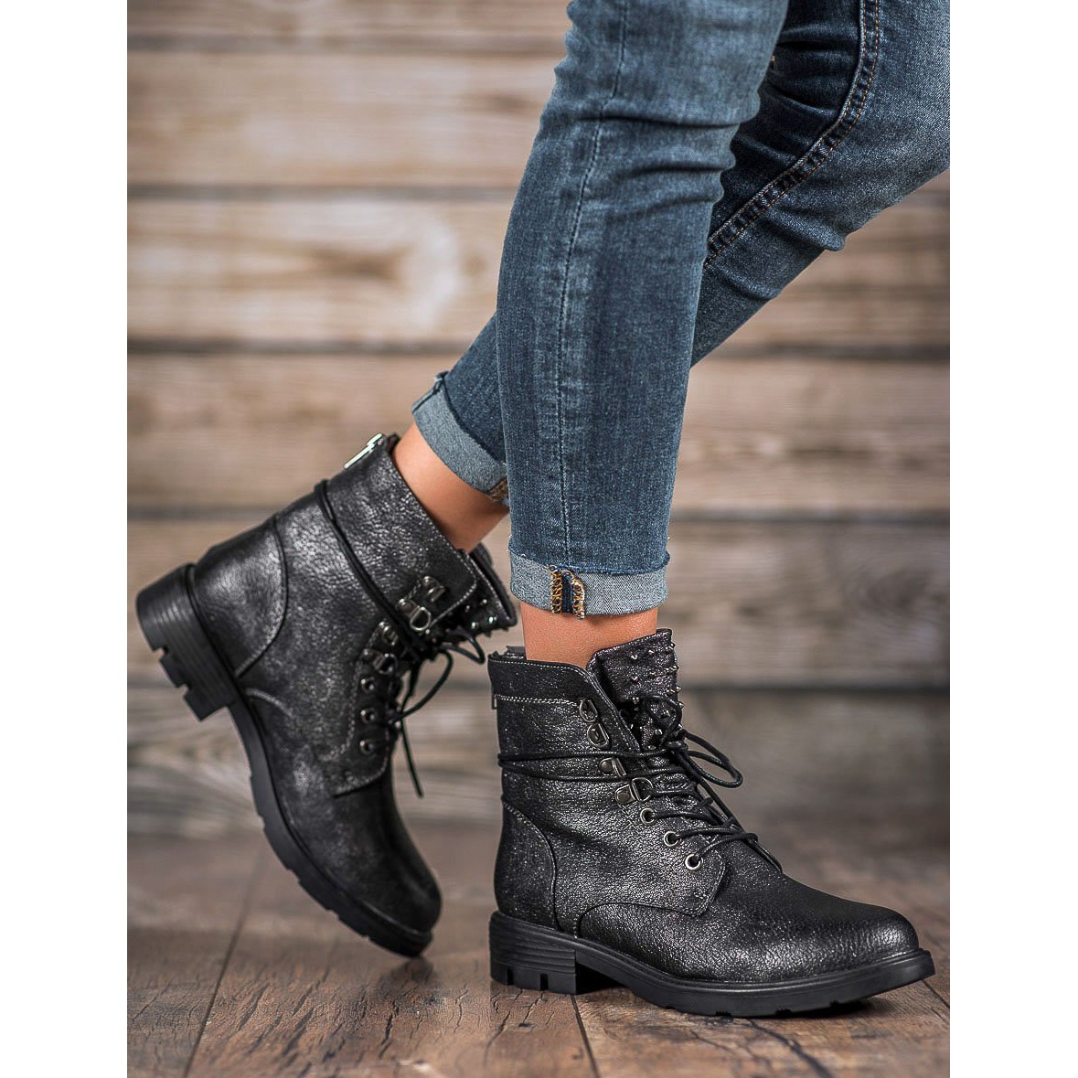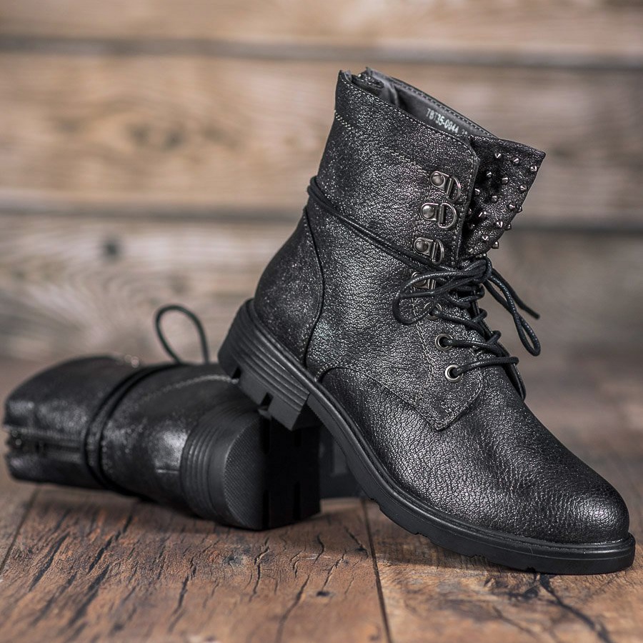 Der 3,5 cm breite Absatz sorgt für Stabilität und Komfort bei alltäglichen Spaziergängen und der knöchelhohe Schaft mit Schnürung unterstreicht den modisch-lässigen Stil. Eine zusätzliche Verzierung sind Metalldüsen auf der Zunge der Schuhe, die ihnen einen leicht redaktionellen Look verleihen.