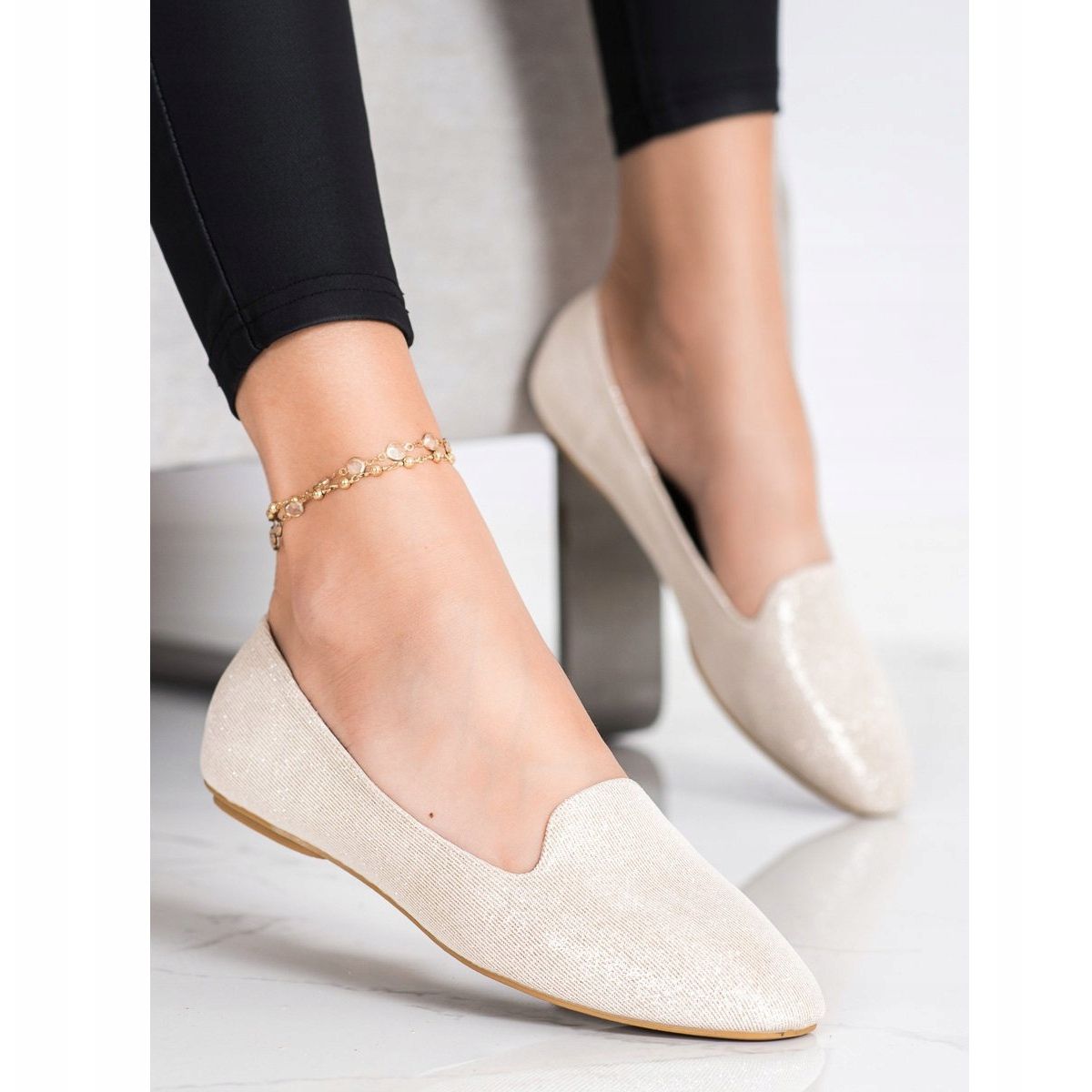 Das Oberteil der Ballerinas besteht aus hochwertigen Materialien und besteht zu 100 % aus Textilgewebe, das mit glitzerndem Glanz die Blicke auf sich zieht. Bei der Innenausstattung der Schuhe wurde Wert auf Komfort gelegt – Kunstleder und ökologische Ledereinlegesohlen sorgen für Tragekomfort auch über lange Stunden hinweg. Die runde Spitze verleiht Charme und der metallische Akzent macht sie zu einer perfekten Ergänzung sowohl für lässige als auch für elegante Stile.
