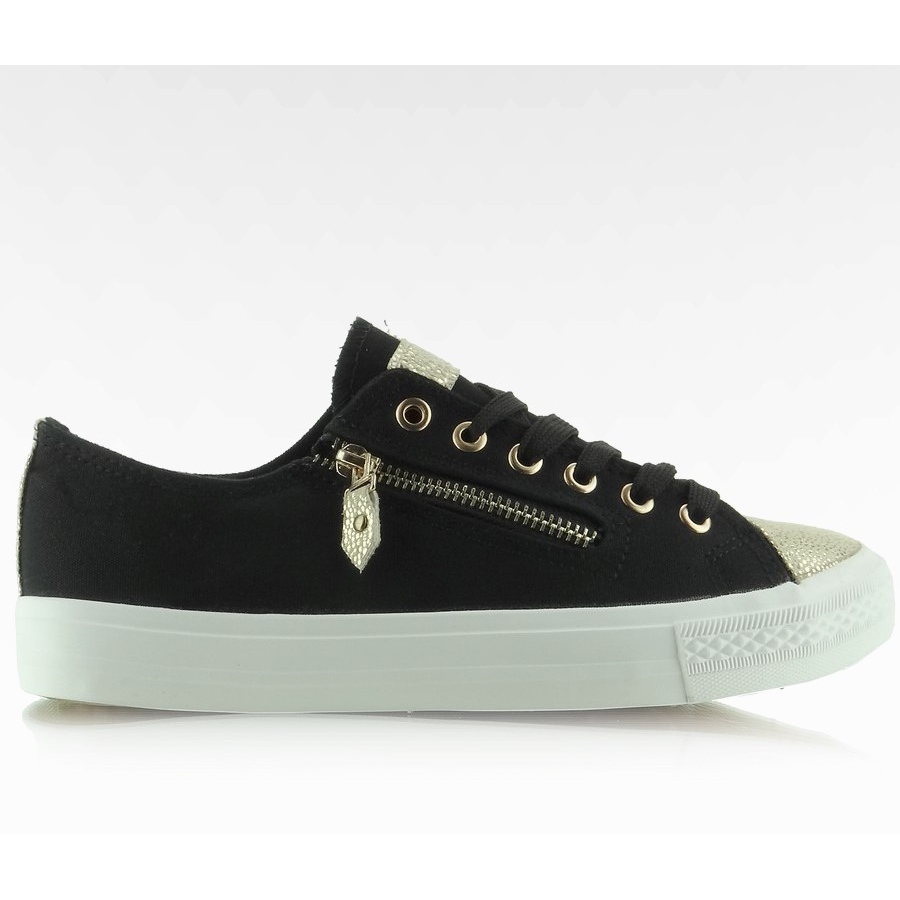 Klassische BL28P Canvas-Sneaker in universellem Schwarz mit glänzenden, goldenen Zehen und einem dezenten Reißverschluss an der Seite des Obermaterials. Ein schlichter, zeitloser Schnitt wird mit einem modischen Akzent kombiniert, wodurch die Schuhe sowohl für den Alltag als auch für den legeren Look geeignet sind. Bequem, solide verarbeitet und leicht – perfekt für die Frühling-Herbst-Saison und Sommerabende.