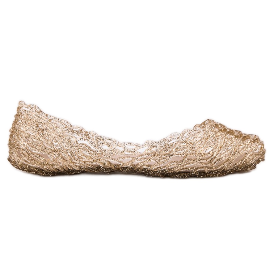 Złote Meliski Vinceza ist die perfekte Wahl für Sommertage und vereint Eleganz und Komfort. Aus hochwertigem Gummi gefertigt, passen sich diese Ballerinas perfekt an den Fuß an und bieten den ganzen Tag über außergewöhnlichen Komfort. Der ökologische Ledereinsatz sorgt für Subtilität, das durchbrochene Muster und die schöne goldene Farbe ziehen die Blicke auf sich und machen jedes Styling einzigartig.