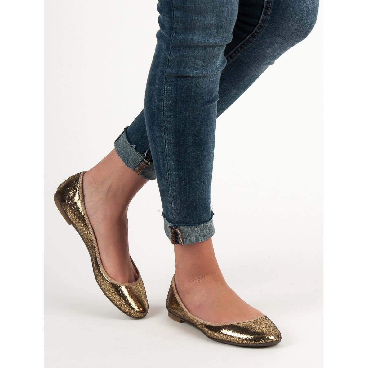 Die goldenen Ballerinas von SHELOVET sind ein Muss in der Garderobe jeder modebewussten Frau! Dieses einzigartige Modell vereint Eleganz mit einem Hauch von Verrücktheit und passt perfekt zu den Sommertrends. Durch den schimmernden Glitzer auf dem Obermaterial unterstreichen diese Ballerinas jedes Styling perfekt und ihre goldene Farbe verleiht Klasse und Chic.