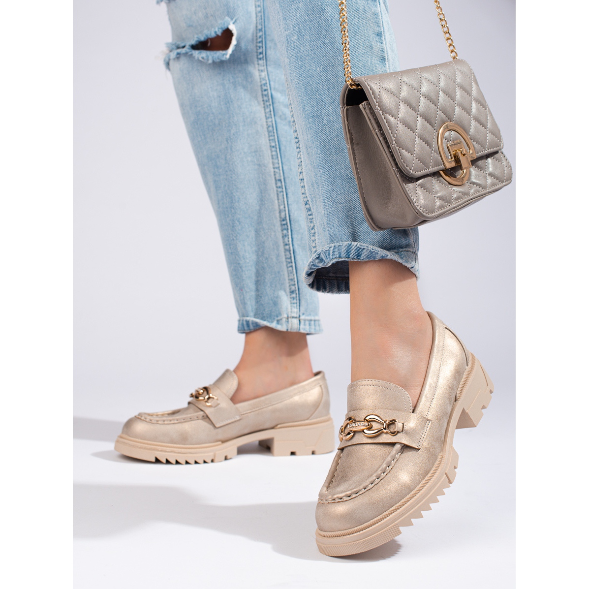 Wählen Sie goldene Schuhe mit Shelovet-Dekor und genießen Sie den Komfort und das Prestige, die sie Ihren alltäglichen und besonderen Momenten verleihen.