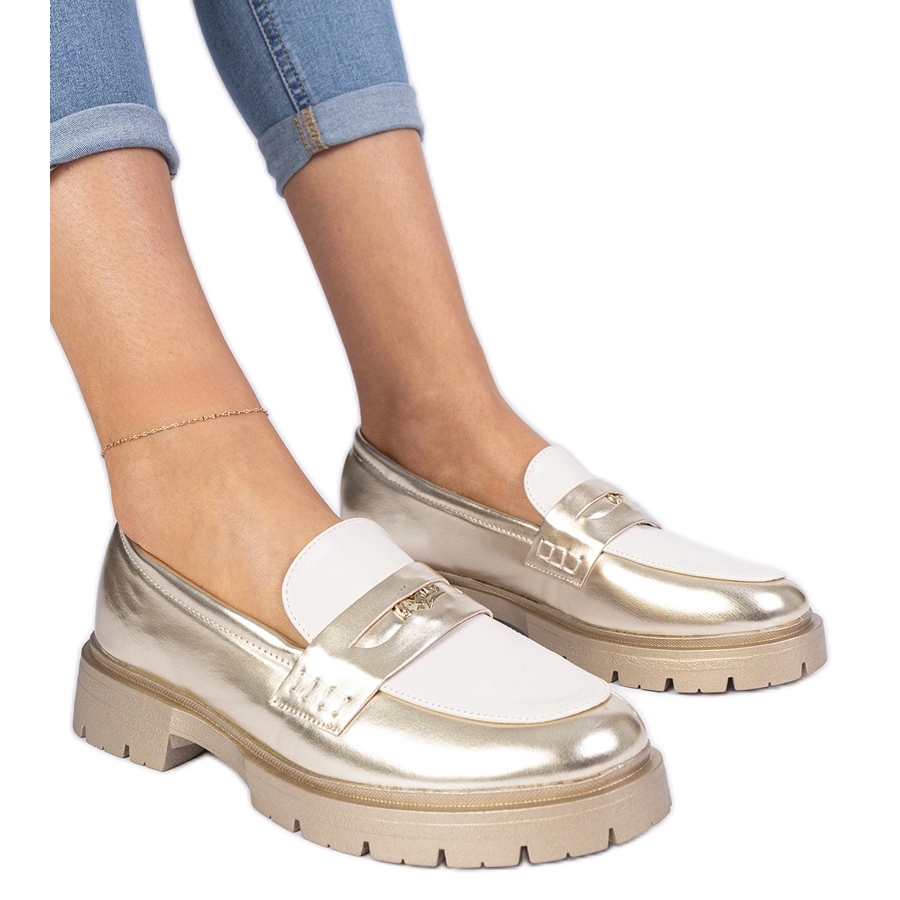 Die einzigartigen goldenen Farben in Kombination mit einem weißen Einsatz verleihen den Mokassins einen einzigartigen Charakter, was sie sowohl zu lässigen als auch zu eleganten Stilisationen perfekt ergänzt. Außerdem verlängert der Mandelzehen die Beine optisch, und der eingesetzte Verschluss erleichtert das Anlegen und Entfernen von Schuhen.