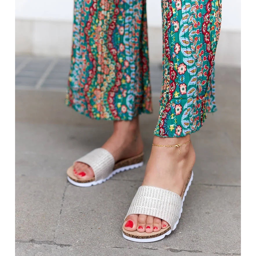 Die Sohle aus Gummi garantiert Stabilität und Halt und ihre weiße Farbe gleicht den goldenen Glanz perfekt aus und sorgt für ein stimmiges und attraktives Design. Die Schuhe sind leicht und eignen sich daher perfekt für den täglichen Gebrauch bei warmem Sommerwetter.