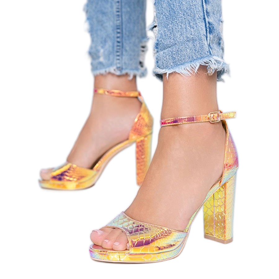 Entdecken Sie Luxus und Komfort in einem der modischsten Modelle der Saison – den goldenen holografischen Millo-Sandalen mit hohen Absätzen! Diese Sandalen eignen sich perfekt für jeden Anlass und sind die perfekte Wahl für Frauen, die sich von der Masse abheben möchten. Sie bestehen aus ökologischem Leder und haben eine dezente Prägung, die an ein Schlangenhautmuster erinnert. Sie ziehen nicht nur durch ihre goldene Farbe die Blicke auf sich, sondern auch durch einen atemberaubenden holografischen Effekt.