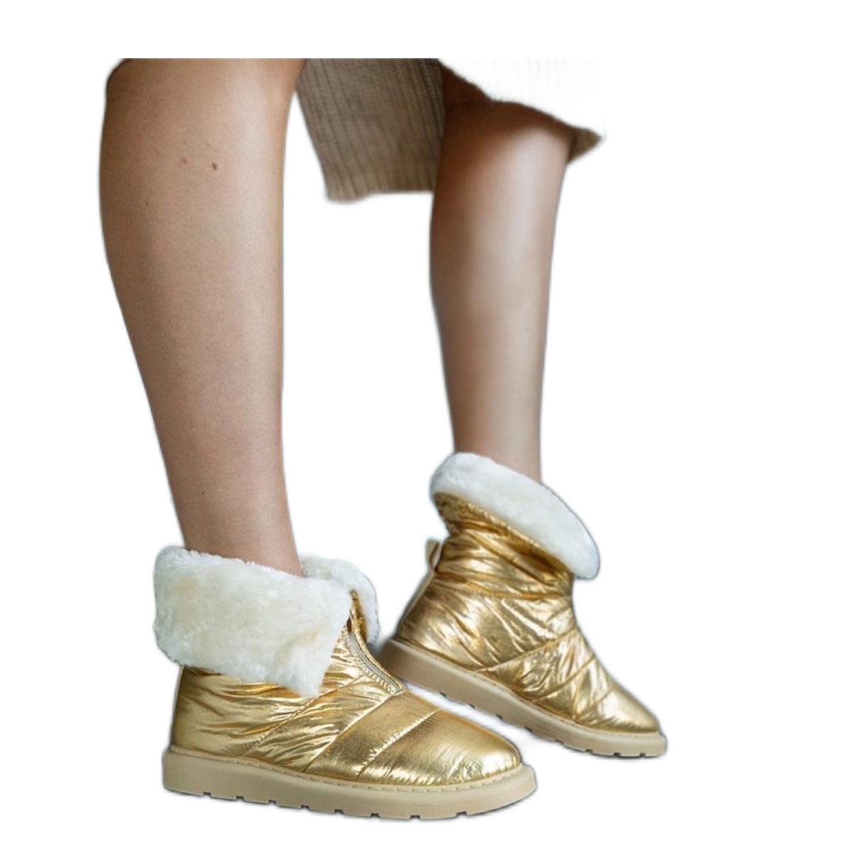 Das warme Innere dieser Schneestiefel garantiert, dass Ihre Füße selbst an den kältesten Tagen angenehm erhitzt werden. Der Reißverschluss erleichtert es einfach, Schuhwaren schnell anzuziehen und zu entfernen, was im täglichen Gebrauch äußerst wichtig ist. Die goldene Farbe des äußeren Stoffes und die beige Sohle aus Gummi fügen Eleganz und moderner Charakter hinzu.