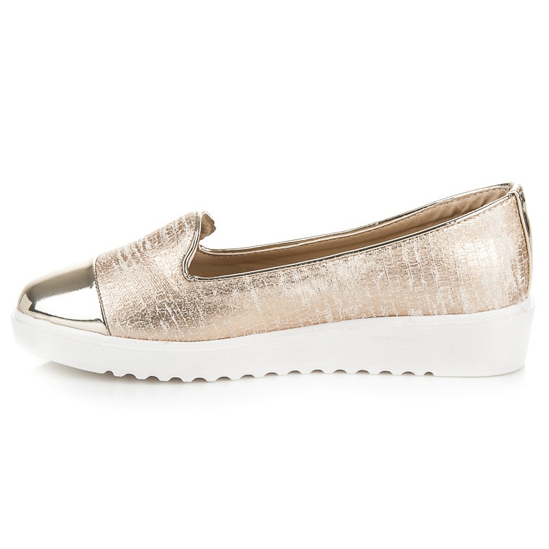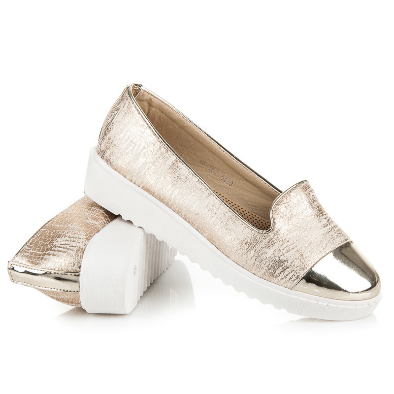 Ihre goldene Farbe verleiht ihnen einen einzigartigen Charakter und passt perfekt zu Alltags- und Abendstilen. Darüber hinaus garantieren die runde Spitze und das 3 cm hohe Plateau ein angenehmes Tragegefühl den ganzen Tag über. Durch den Slip-On-Verschluss ist das An- und Ausziehen der Schuhe besonders einfach.