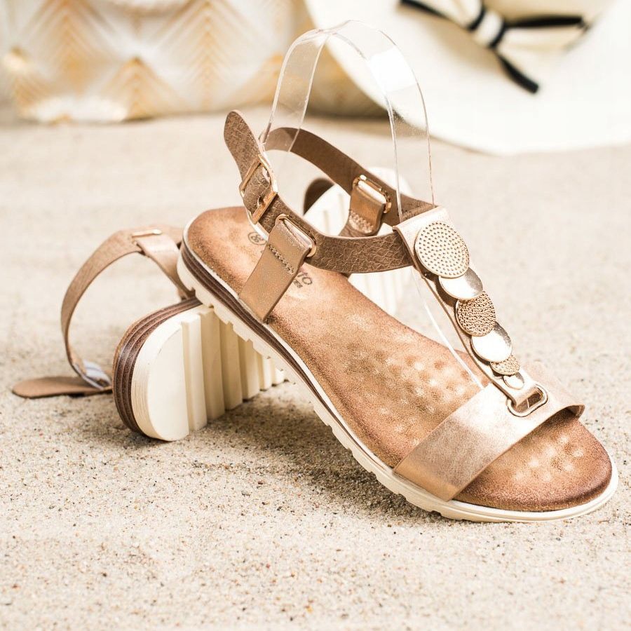 Entdecken Sie einzigartige goldene Evento-Sandalen mit Verzierungen, die jedem Ihrer Outfits Glanz verleihen! Diese eleganten und dennoch lässigen Sandalen sind die perfekte Wahl für Alltagsausflüge und Feiern. Dank des offenen Absatzes und des flachen Absatzes (Höhe 2,0 cm) fühlen Sie sich den ganzen Tag über wohl.