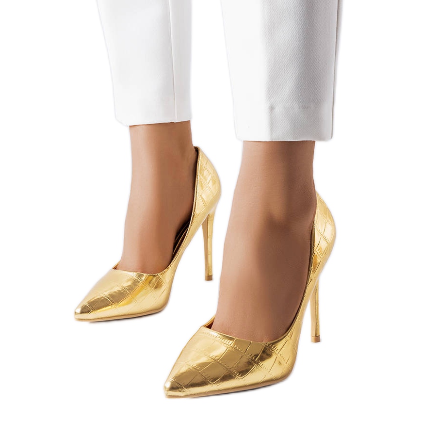Entdecken Sie einzigartigen Stil mit unseren goldenen High Heels mit Raison-Prägung! Diese umwerfenden Pumps im Krokodilleder-Design verleihen jedem Styling einen Hauch von Luxus und Eleganz. Der schmale, hohe Absatz von 10 cm Höhe betont die Beine perfekt und macht die Silhouette noch sinnlicher. Die spitze Spitze verleiht dem gesamten Look einen raffinierten Charakter.
