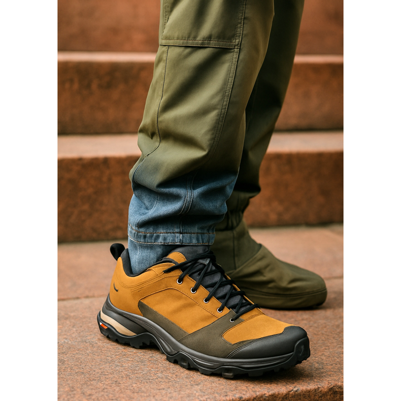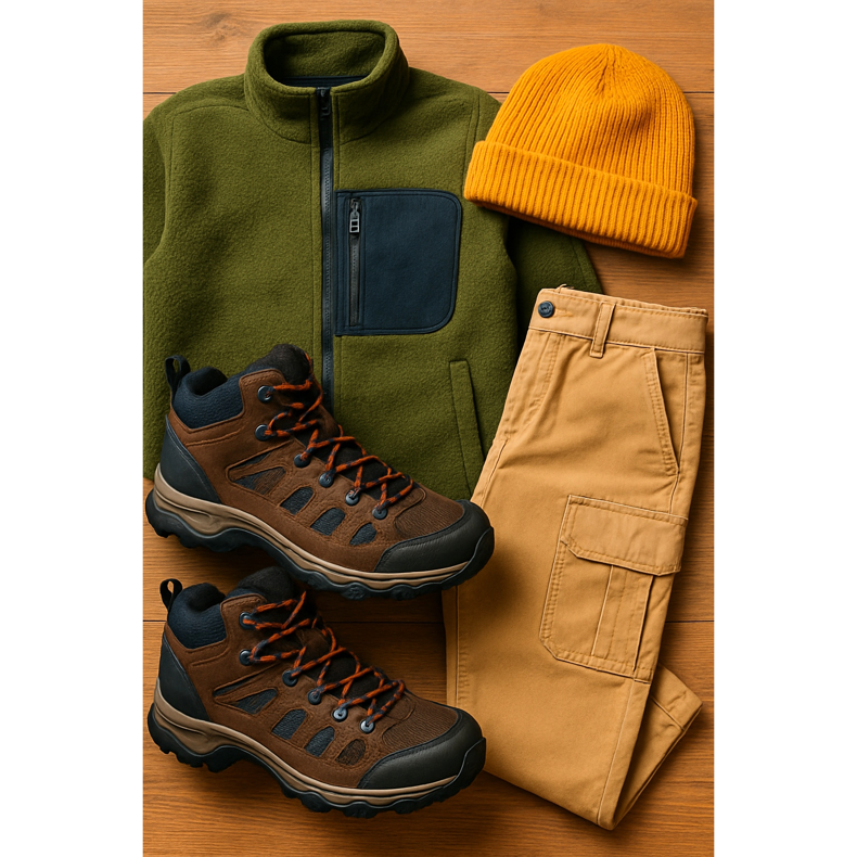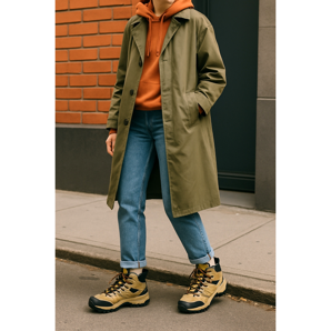 Im Gorpcore-Stil dreht sich alles um Authentizität und Komfort. Trekkingschuhe (z. B. Salomon, Merrell oder Timberland) werden mit Alltagskleidung kombiniert, nicht mit kompletter Kletterausrüstung. Sie passen hervorragend zu weiten Baggy-Jeans, Cargohosen mit vielen Taschen oder Trainingsanzügen aus technischen Materialien. Wichtig ist, dass das Ganze lässig und funktional wirkt, nicht verkleidet.