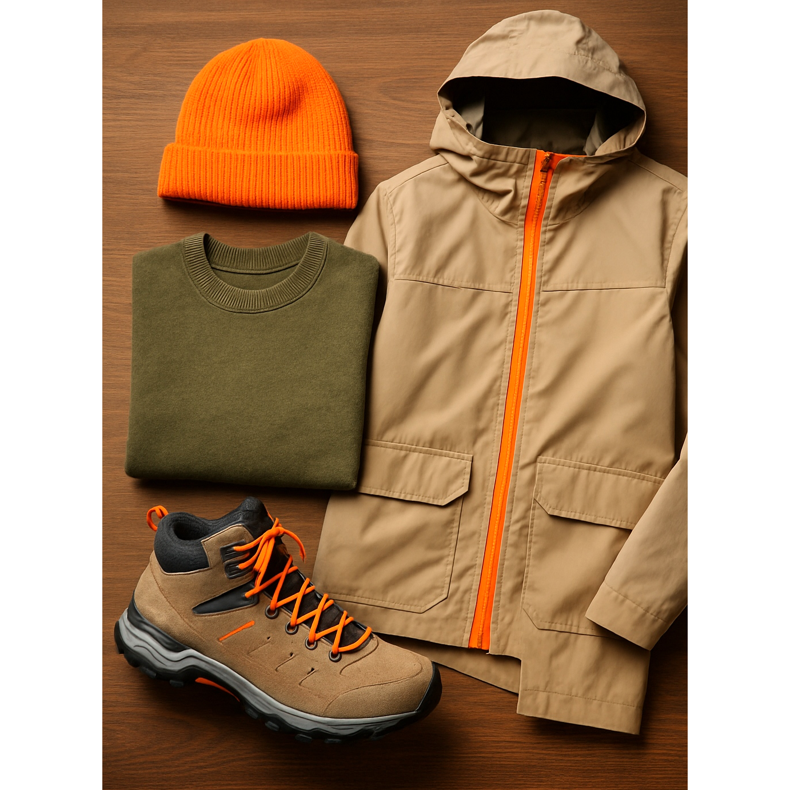 Der Schlüssel zu einem gelungenen Styling ist der Farbkontrast. Wanderschuhe haben oft leuchtende Neoneinsätze. Nutzen Sie es! Wenn Sie Schuhe mit orangefarbenen Schnürsenkeln haben, kombinieren Sie diese mit einer Mütze in derselben Farbe oder einem Regenmantel mit einem ähnlichen Akzent. Halten Sie den Rest des Outfits in gedämpften Erdfarben – Beige, Grün und Braun, die die Essenz des Gorpcore-Stils ausmachen.