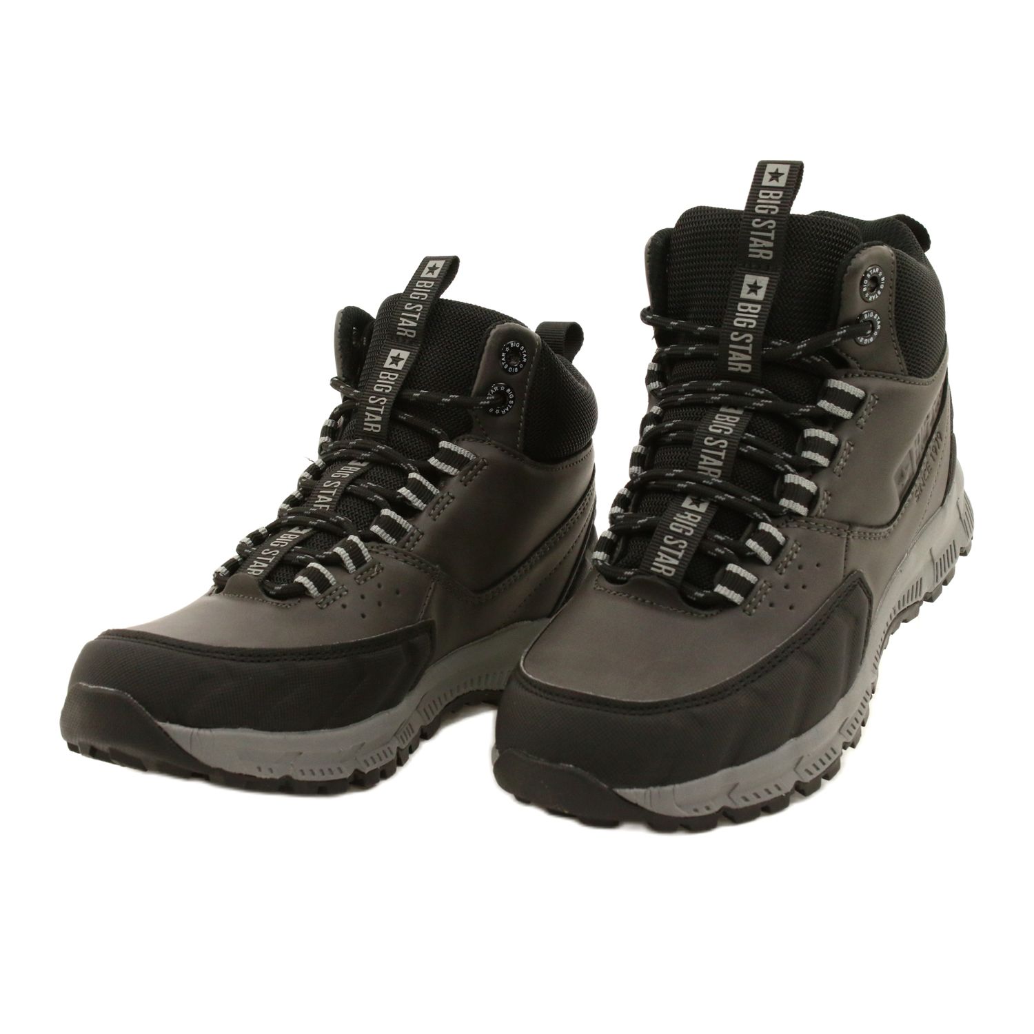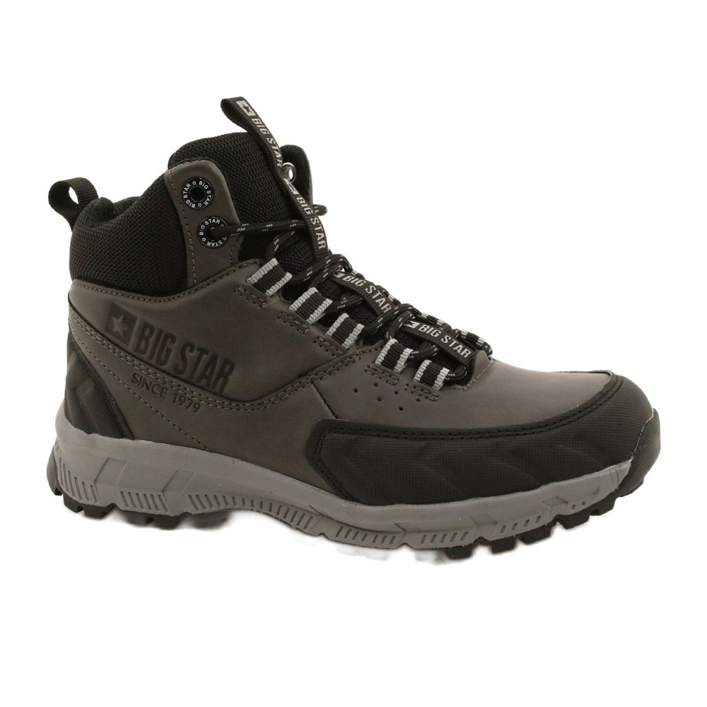 Moderne, komfortable und universelle Frauen -Trekking von Big Star, die für den täglichen Gebrauch geschaffen wurden. Ein ökologisches Leder -Obermaterial in Graustufen mit schwarzen Akzenten verleiht einen klassischen und modischen Look, der sowohl in städtischen Stylisationen als auch während des kürzeren Wanderns funktioniert.